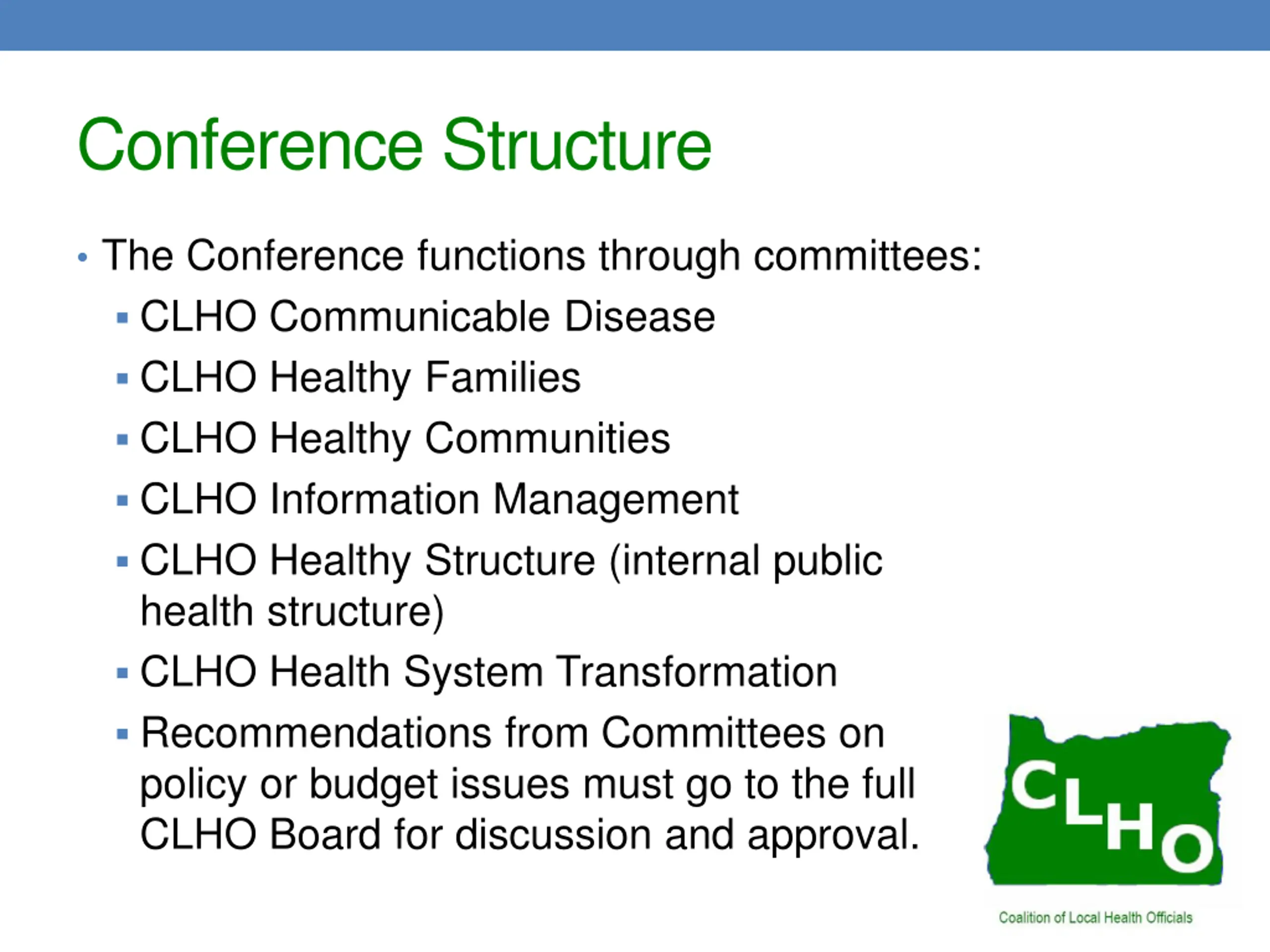 Conference Structure The Conference functions through committees: CLHO Communicable Disease CLHO Healthy Families CLHO Healthy Communities CLHO Information Management CLHO Healthy Structure (internal public health structure) CLHO Health System Transformation Recommendations from Committees on policy or budget issues must go to the full CLHO Board for discussion and approval.