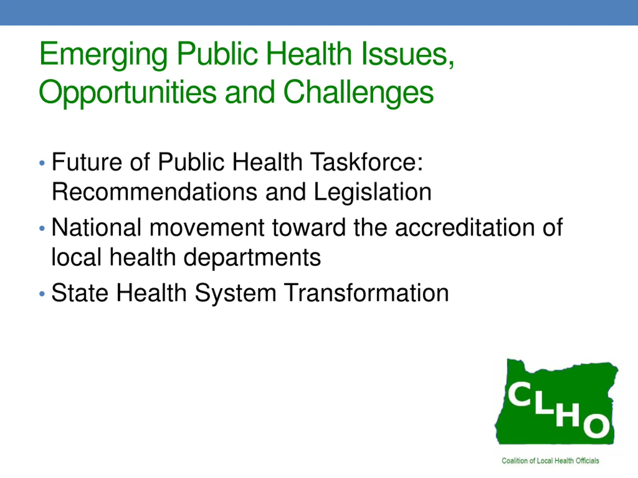 Emerging Public Health Issues, Opportunities and Challenges Future of Public Health Taskforce: Recommendations and Legislation National movement toward the accreditation of local health departments State Health System Transformation