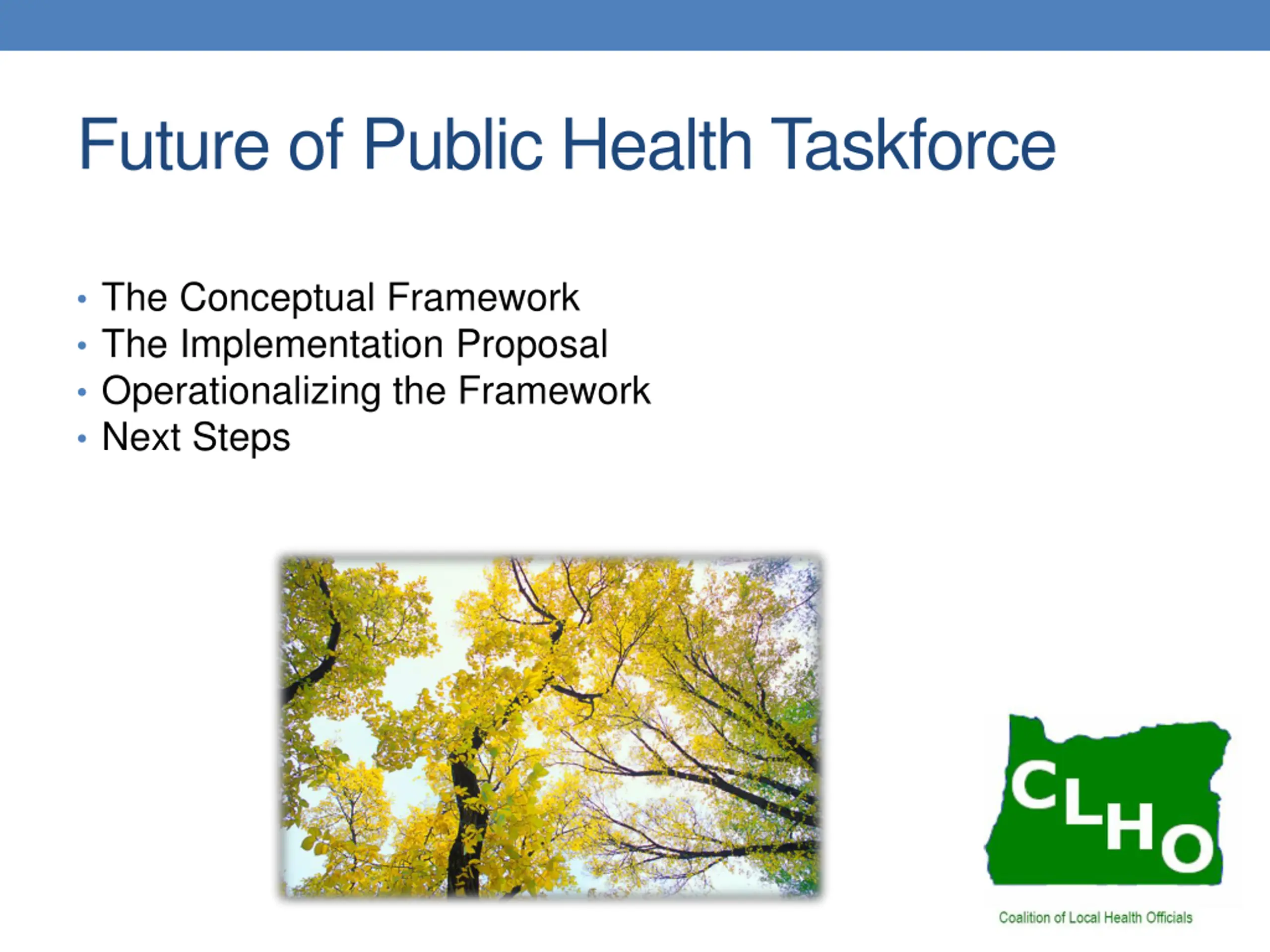 Future of Public Health Taskforce The Conceptual Framework The Implementation Proposal Operationalizing the Framework Next Steps