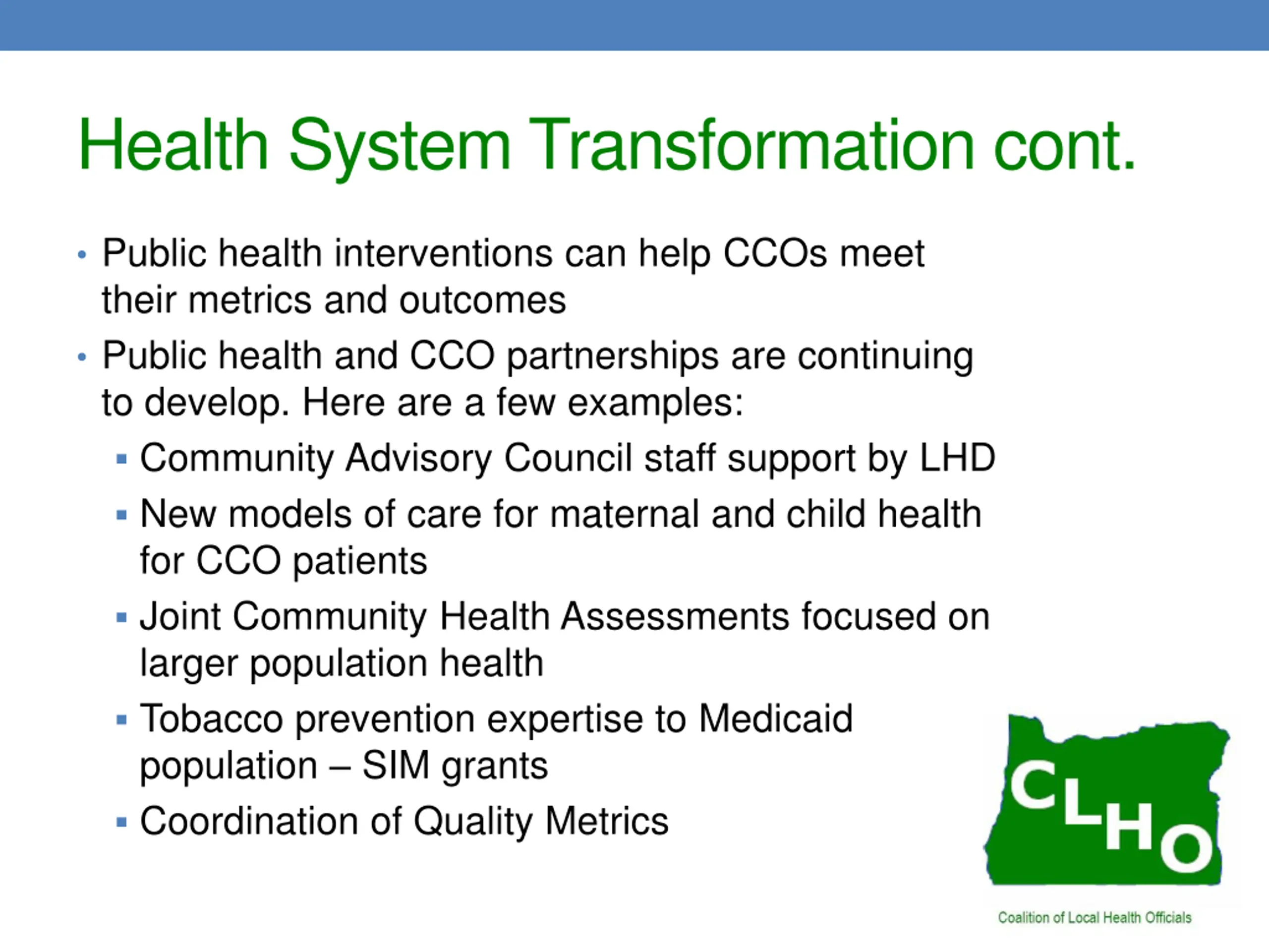 Health System Transformation cont. Public health interventions can help CCOs meet their metrics and outcomes Public health and CCO partnerships are continuing to develop. Here are a few examples: Community Advisory Council staff support by LHD New models of care for maternal and child health for CCO patients Joint Community Health Assessments focused on larger population health Tobacco prevention expertise to Medicaid population SIM grants Coordination of Quality Metrics