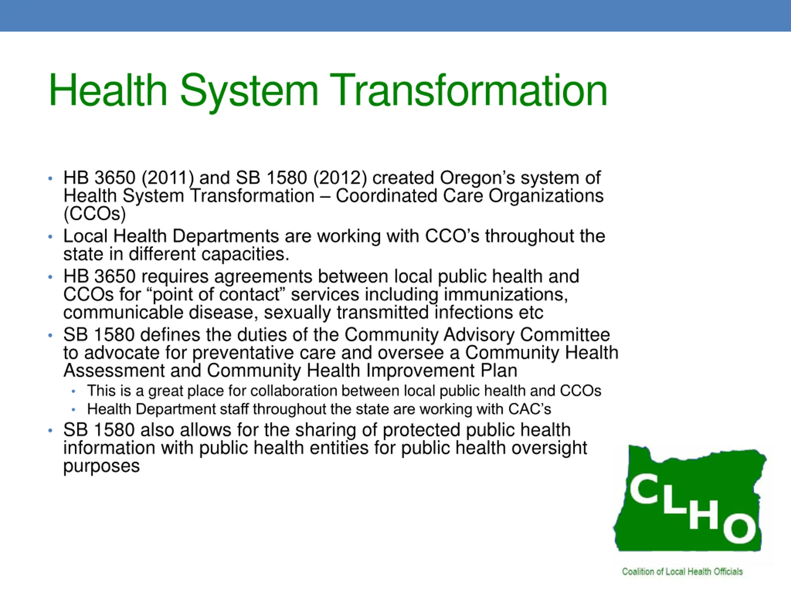 Health System Transformation HB 3650 (2011) and SB 1580 (2012) created Oregon s system of Health System Transformation Coordinated Care Organizations (CCOs) Local Health Departments are working with CCO s throughout the state in different capacities. HB 3650 requires agreements between local public health and CCOs for point of contact services including immunizations, communicable disease, sexually transmitted infections etc SB 1580 defines the duties of the Community Advisory Committee to advocate for preventative care and oversee a Community Health Assessment and Community Health Improvement Plan This is a great place for collaboration between local public health and CCOs Health Department staff throughout the state are working with CAC s SB 1580 also allows for the sharing of protected public health information with public health entities for public health oversight purposes