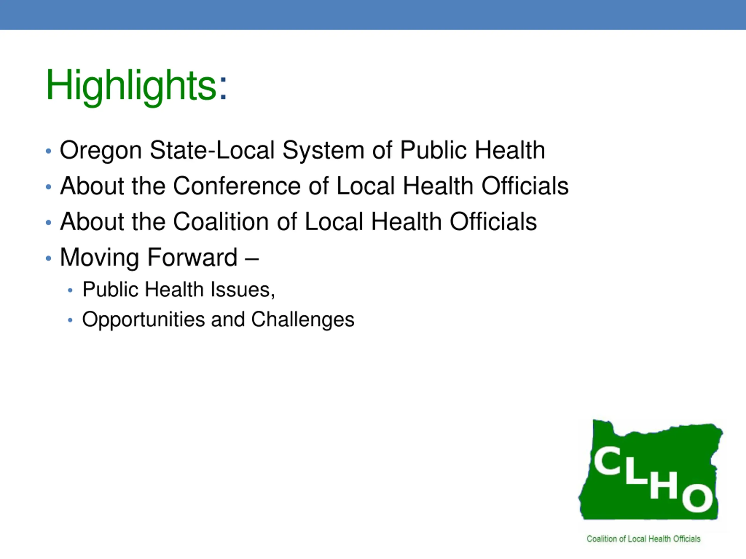 Highlights: Oregon State-Local System of Public Health About the Conference of Local Health Officials About the Coalition of Local Health Officials Moving Forward Public Health Issues, Opportunities and Challenges