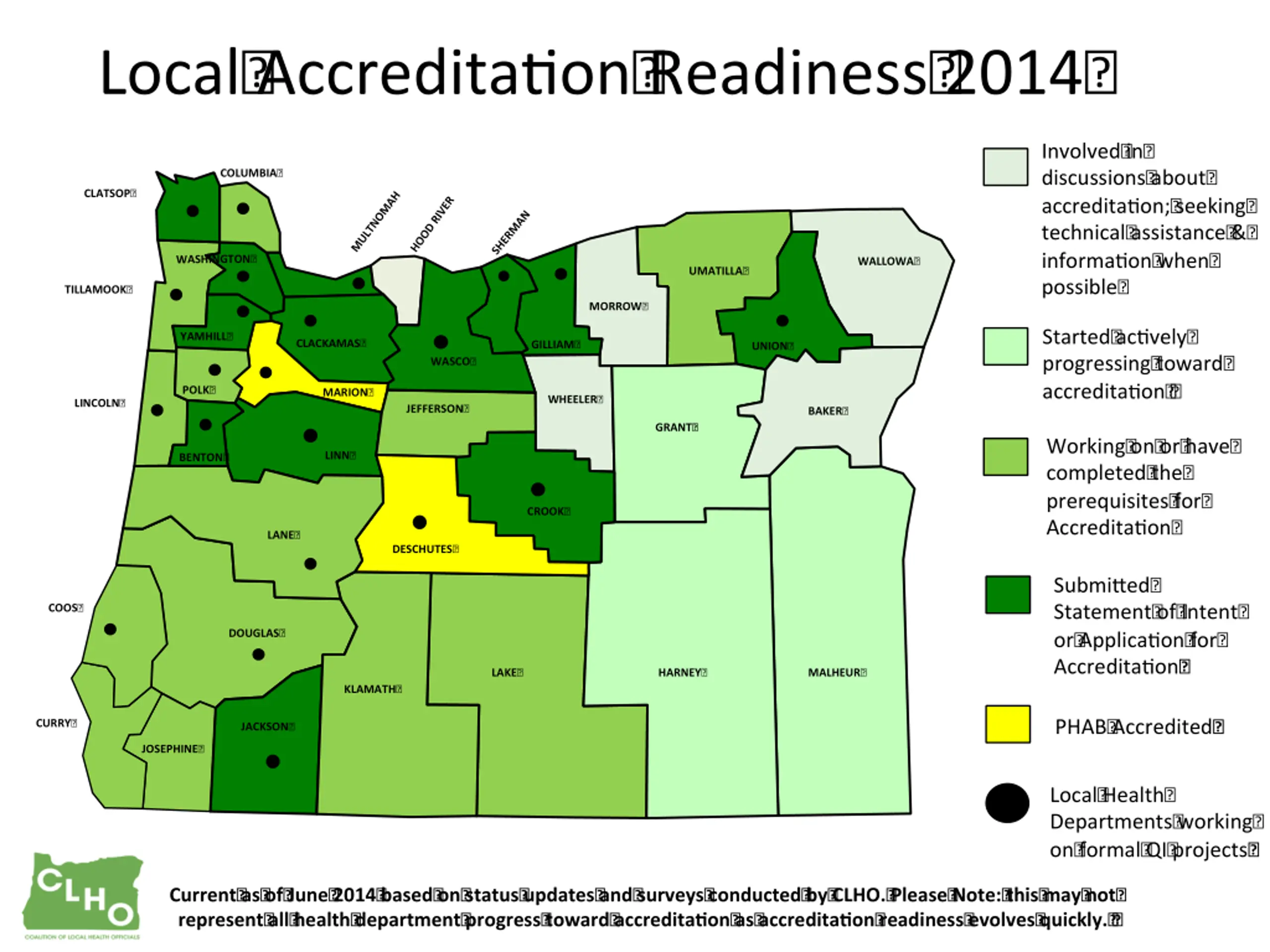 Local? Accredita on? Readiness? 2014? Accreditation of Local Health Departments in Oregon Involved? in? discussions? about? accredita on;? seeking? technical? assistance? &? informa on? when? possible? COLUMBIA? CLATSOP? WASHINGTON? WALLOWA? UMATILLA? TILLAMOOK? MORROW? Started? ac vely? progressing? toward? accredita on? ? YAMHILL? CLACKAMAS? GILLIAM? UNION? WASCO? POLK? MARION? WHEELER? LINCOLN? JEFFERSON? BAKER? GRANT? Working? on? or? have? completed? the? prerequisites? for? Accredita on? LINN? BENTON? CROOK? LANE? DESCHUTES? Submi ed? Statement? of? Intent? or? Applica on? for? Accredita on? COOS? DOUGLAS? LAKE? HARNEY? MALHEUR? KLAMATH? PHAB? Accredited? CURRY? JACKSON? JOSEPHINE? Local? Health? Departments? working? on? formal? QI? projects? Current? as? of? June? 2014? based? on? status? updates? and? surveys? conducted? by? CLHO.? Please? Note:? this? may? not? represent? all? health? department? progress? toward? accredita on? as? accredita on? readiness? evolves? quickly.? ?