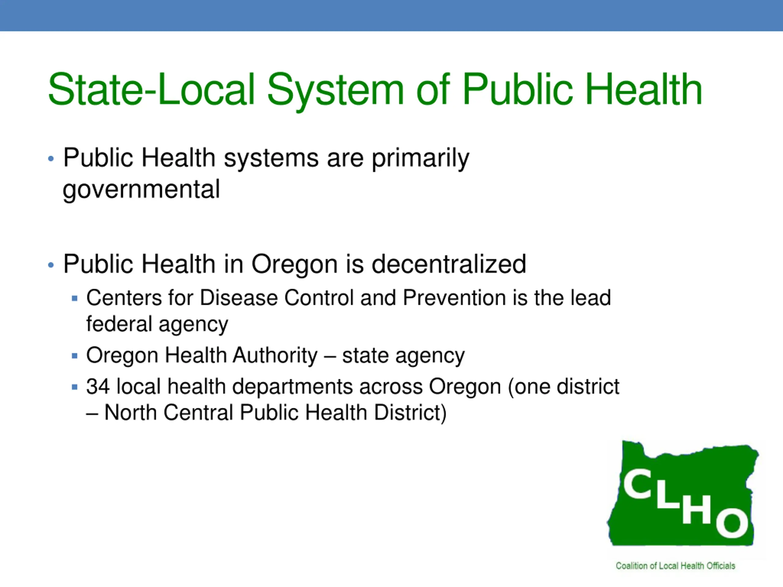 State-Local System of Public Health Public Health systems are primarily governmental Public Health in Oregon is decentralized Centers for Disease Control and Prevention is the lead federal agency Oregon Health Authority state agency 34 local health departments across Oregon (one district North Central Public Health District)