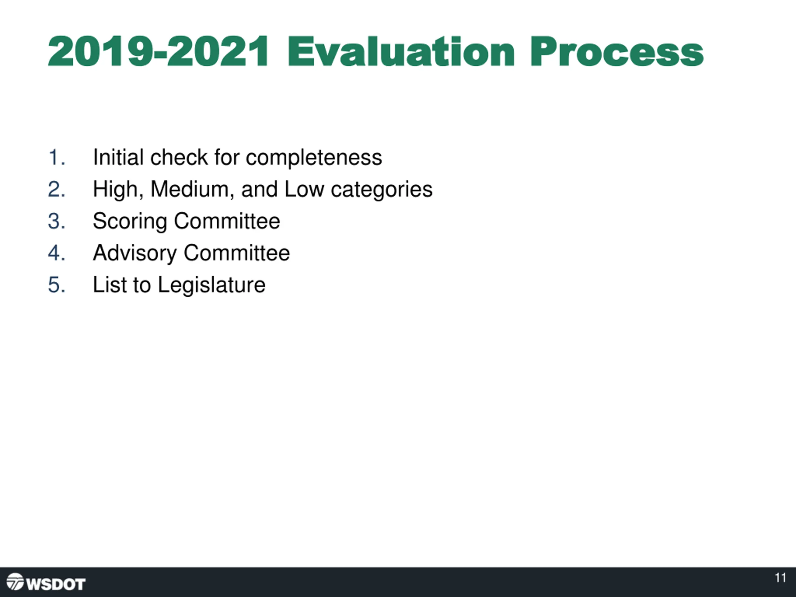 2019 2019- -2021 Evaluation Process 2021 Evaluation Process 1. 2. 3. 4. 5. Initial check for completeness High, Medium, and Low categories Scoring Committee Advisory Committee List to Legislature 11