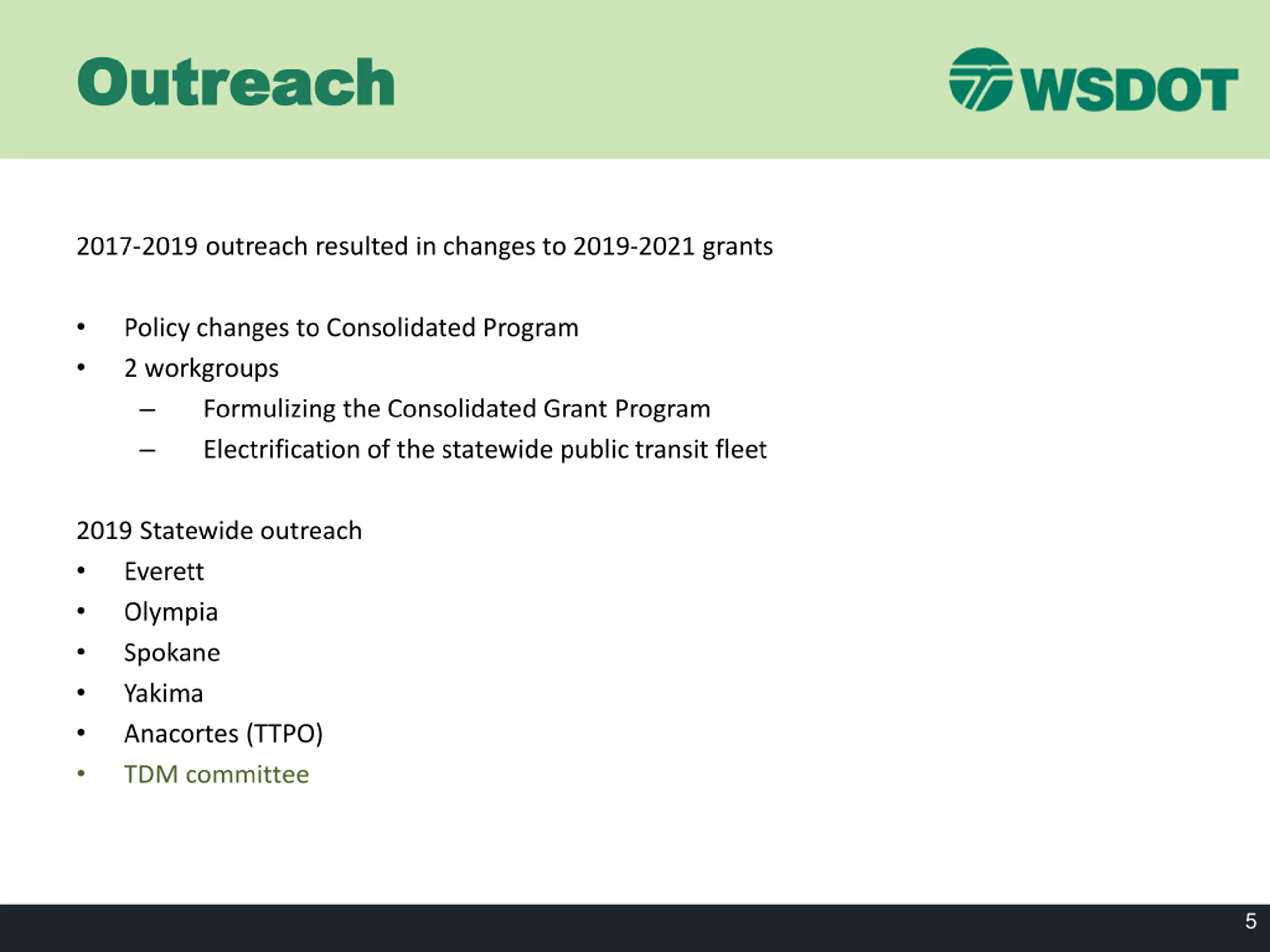Goals and Outcomes Goals and Outcomes Goals Increase alignment of grant program investments with agency strategic goals, with an emphasis on access, mobility, safety and filling performance gaps. Improve communication and collaboration with and between partners (WSDOT regions, local governments, grantees, and MPOs/RTPOs) to deliver better transportation system outcomes. Outcomes Increased consent on decisions Better projects being funded Sustainable projects that are supported by local communities Reduced resources needed to apply for and select grants for funding 4