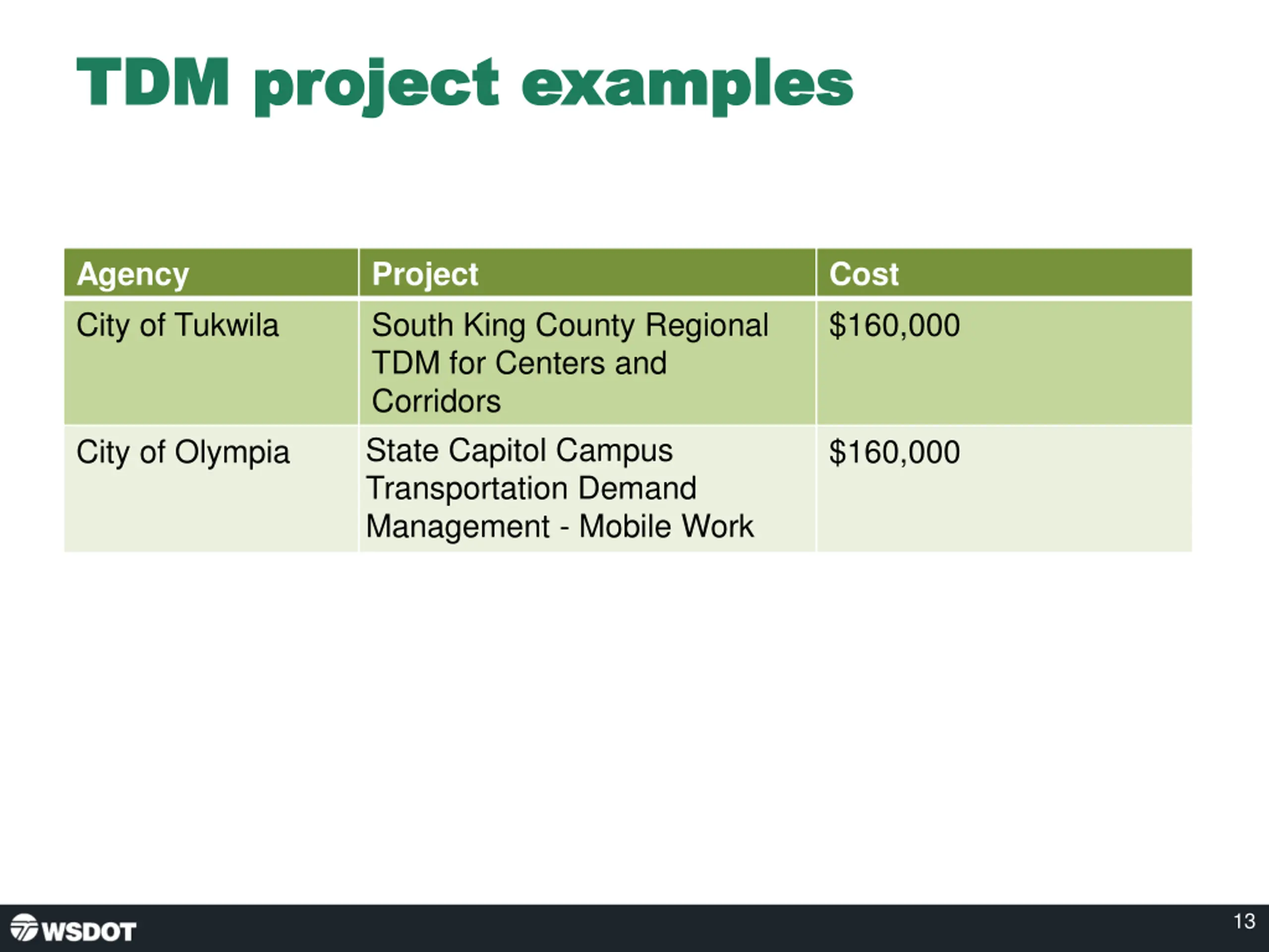 TDM project examples TDM project examples Agency City of Tukwila Project South King County Regional TDM for Centers and Corridors State Capitol Campus Transportation Demand Management - Mobile Work Cost $160,000 City of Olympia $160,000 13