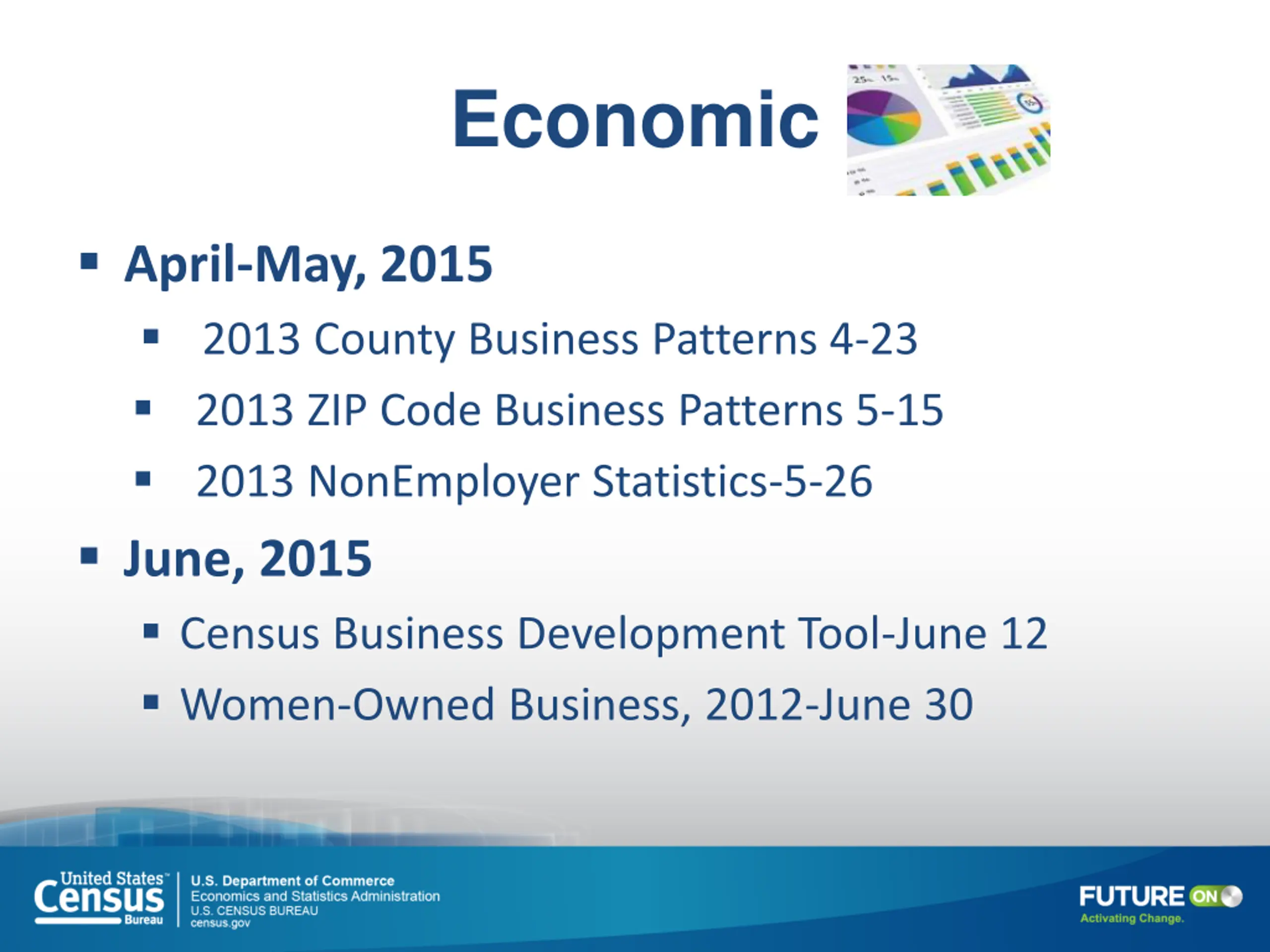 Economic April-May, 2015 2013 County Business Patterns 4-23 2013 ZIP Code Business Patterns 5-15 2013 NonEmployer Statistics-5-26 June, 2015 Census Business Development Tool-June 12 Women-Owned Business, 2012-June 30