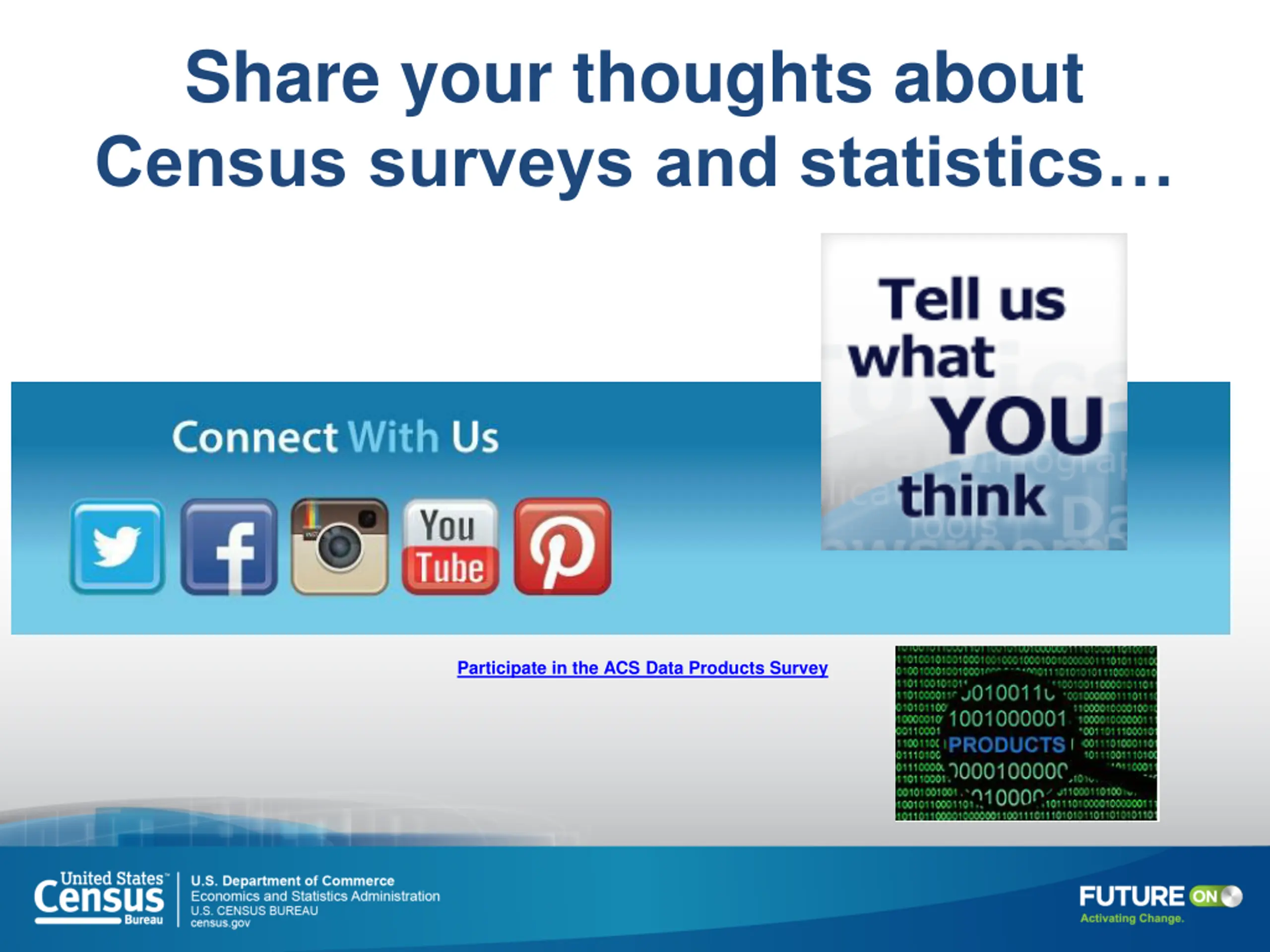 Share your thoughts about Census surveys and statistics Researching products Participate in the ACS Data Products Survey