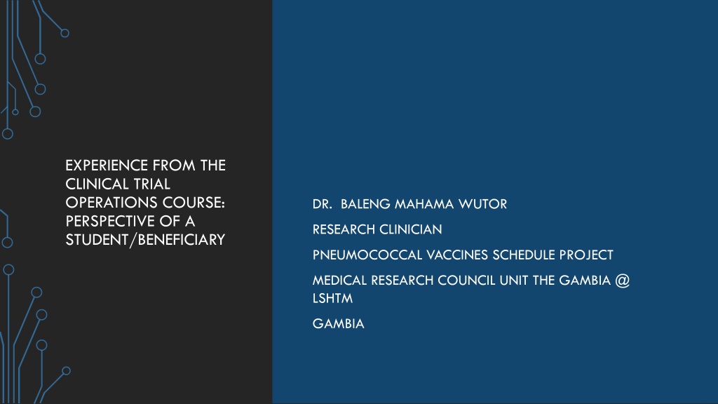 EXPERIENCE FROM THE CLINICAL TRIAL OPERATIONS COURSE: PERSPECTIVE OF A STUDENT/BENEFICIARY DR. BALENG MAHAMA WUTOR RESEARCH CLINICIAN PNEUMOCOCCAL VACCINES SCHEDULE PROJECT MEDICAL RESEARCH COUNCIL UNIT THE GAMBIA @ LSHTM GAMBIA