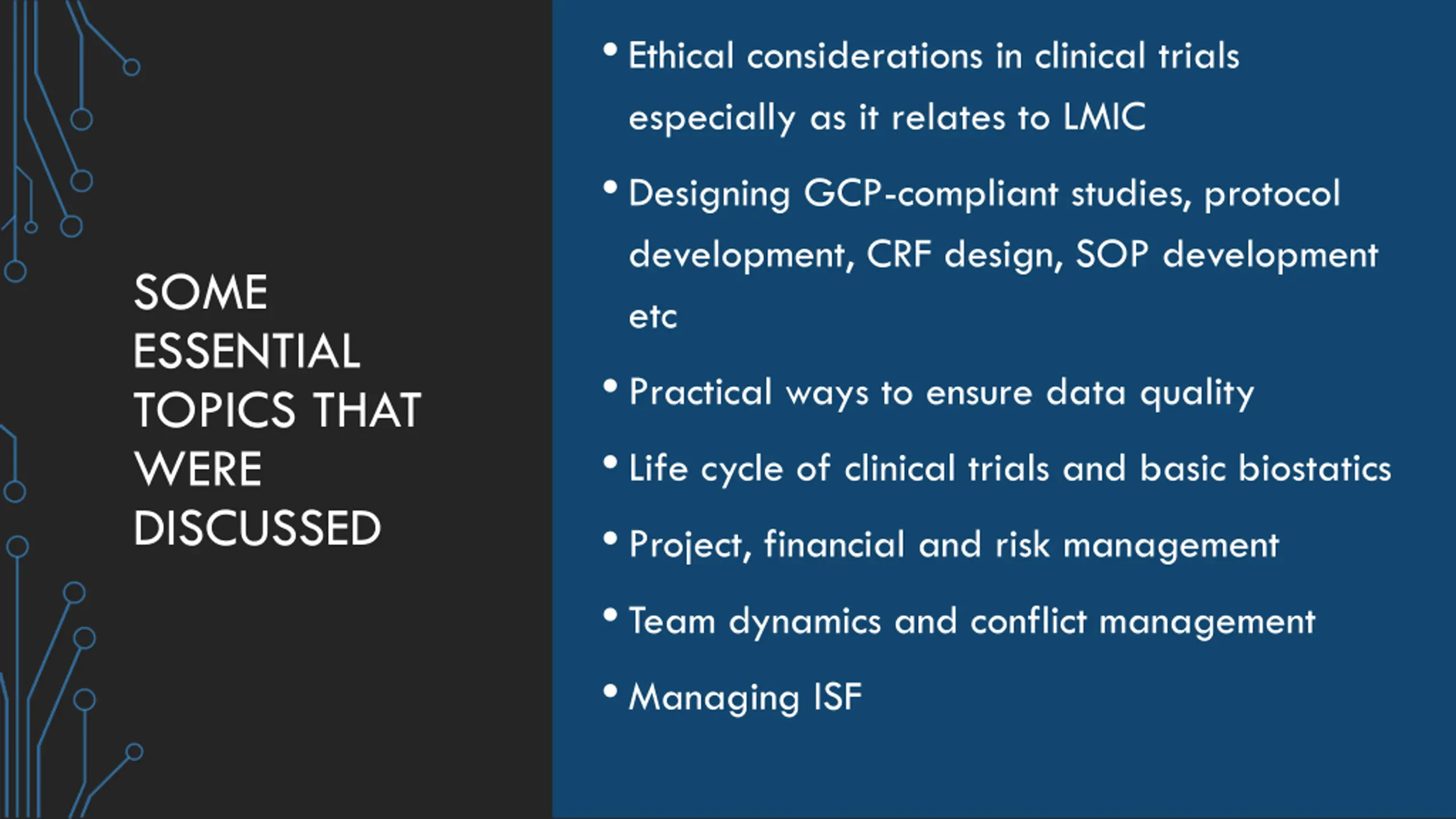Ethical considerations in clinical trials especially as it relates to LMIC Designing GCP-compliant studies, protocol development, CRF design, SOP development etc Practical ways to ensure data quality Life cycle of clinical trials and basic biostatics Project, financial and risk management Team dynamics and conflict management Managing ISF SOME ESSENTIAL TOPICS THAT WERE DISCUSSED