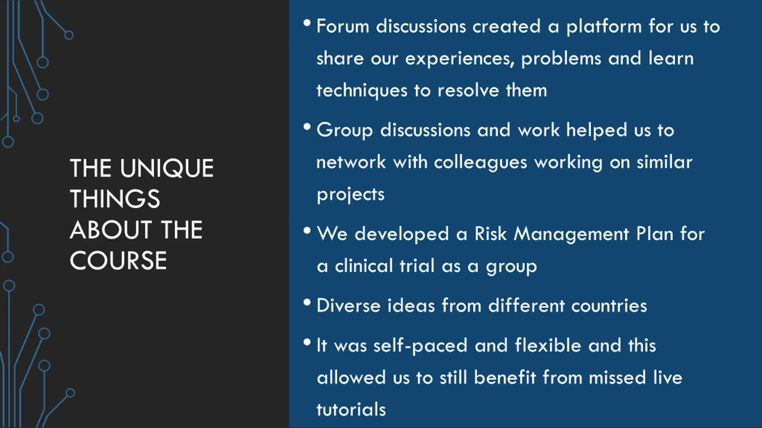 Forum discussions created a platform for us to share our experiences, problems and learn techniques to resolve them Group discussions and work helped us to network with colleagues working on similar projects We developed a Risk Management Plan for a clinical trial as a group Diverse ideas from different countries It was self-paced and flexible and this allowed us to still benefit from missed live tutorials THE UNIQUE THINGS ABOUT THE COURSE