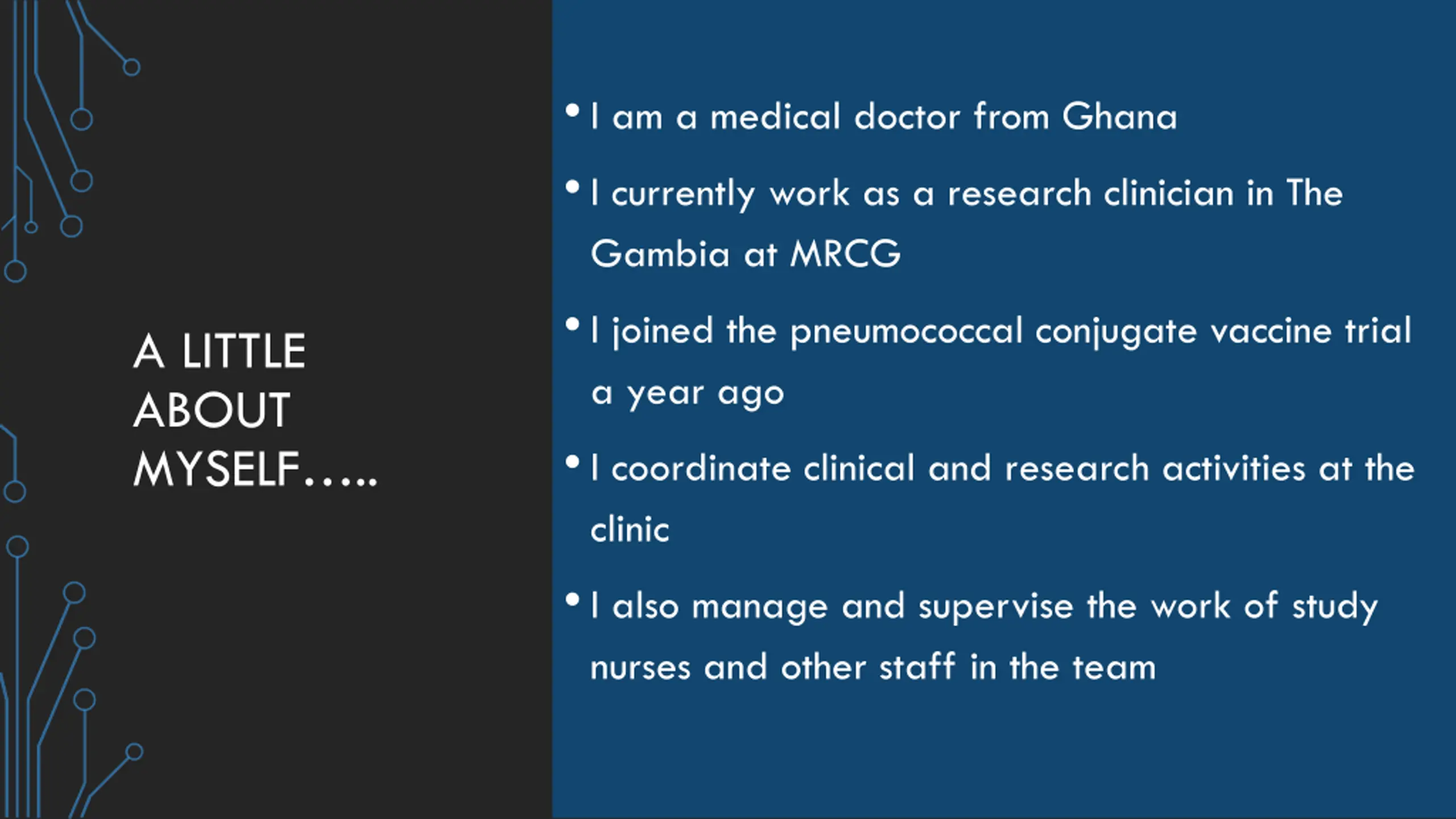 I am a medical doctor from Ghana I currently work as a research clinician in The Gambia at MRCG I joined the pneumococcal conjugate vaccine trial a year ago I coordinate clinical and research activities at the clinic I also manage and supervise the work of study nurses and other staff in the team A LITTLE ABOUT MYSELF ..