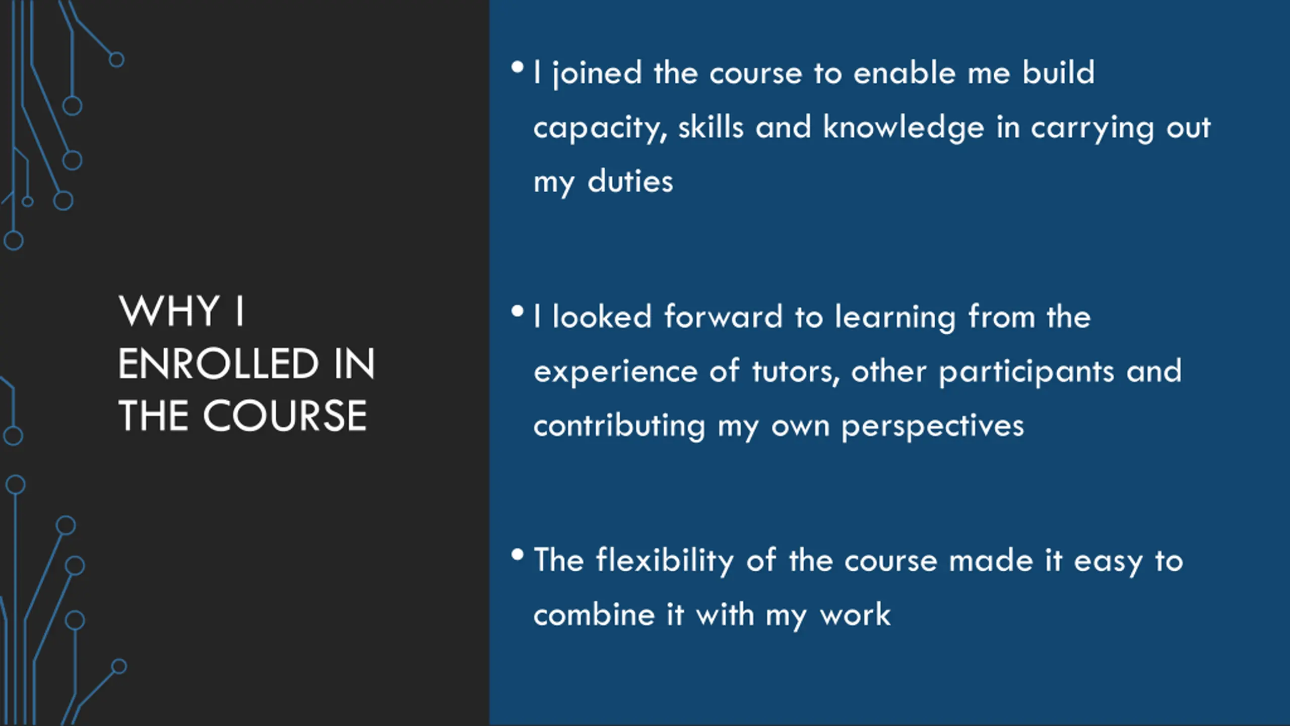 I joined the course to enable me build capacity, skills and knowledge in carrying out my duties WHY I ENROLLED IN THE COURSE I looked forward to learning from the experience of tutors, other participants and contributing my own perspectives The flexibility of the course made it easy to combine it with my work