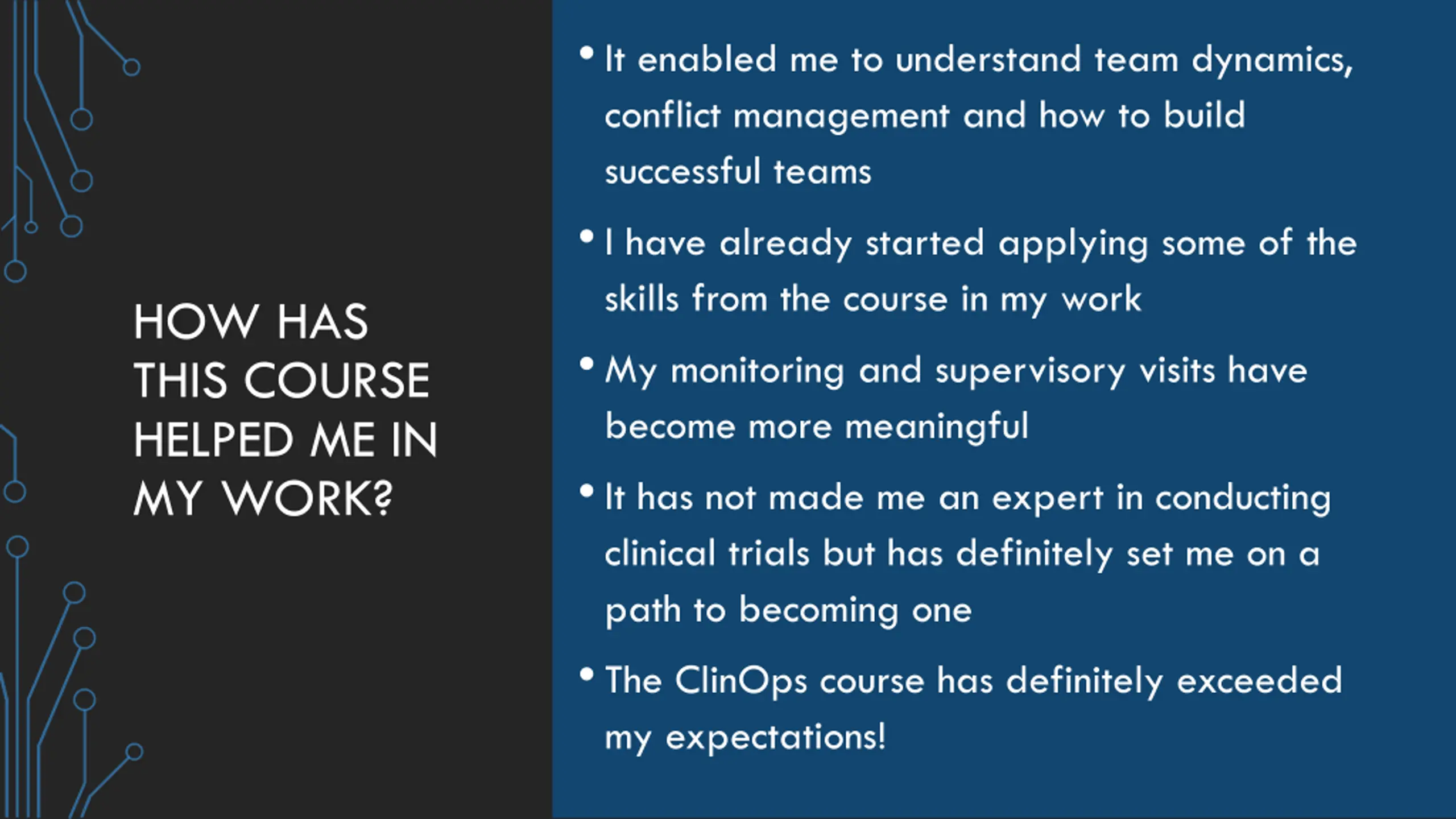 It enabled me to understand team dynamics, conflict management and how to build successful teams I have already started applying some of the skills from the course in my work My monitoring and supervisory visits have become more meaningful It has not made me an expert in conducting clinical trials but has definitely set me on a path to becoming one The ClinOps course has definitely exceeded my expectations! HOW HAS THIS COURSE HELPED ME IN MY WORK?