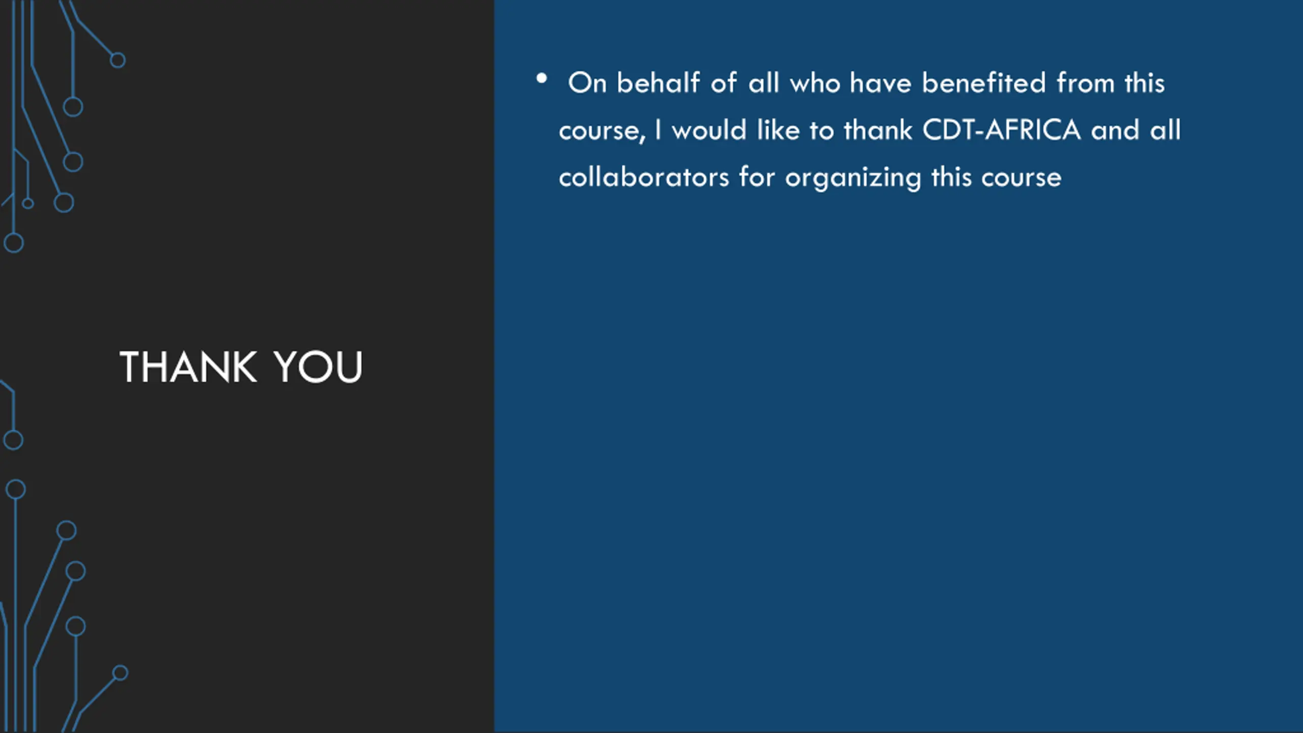 On behalf of all who have benefited from this course, I would like to thank CDT-AFRICA and all collaborators for organizing this course THANK YOU