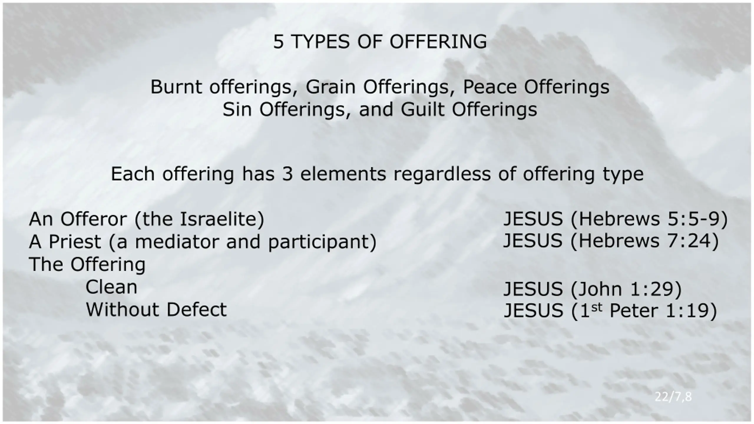 5 TYPES OF OFFERING Burnt offerings, Grain Offerings, Peace Offerings Sin Offerings, and Guilt Offerings Each offering has 3 elements regardless of offering type JESUS (Hebrews 5:5-9) JESUS (Hebrews 7:24) An Offeror (the Israelite) A Priest (a mediator and participant) The Offering Clean Without Defect JESUS (John 1:29) JESUS (1st Peter 1:19) 22/7,8