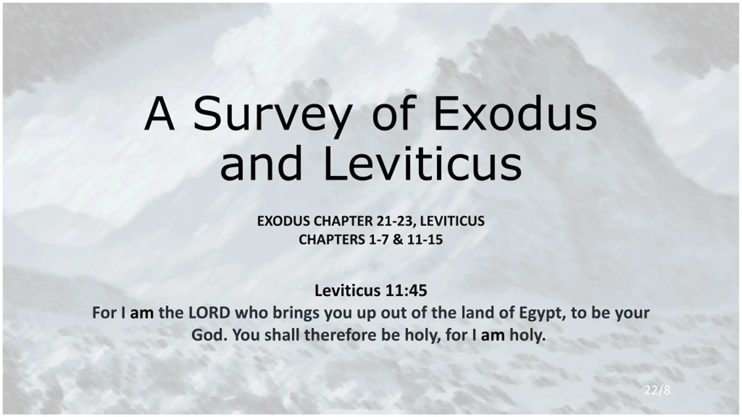 A Survey of Exodus and Leviticus EXODUS CHAPTER 21-23, LEVITICUS CHAPTERS 1-7 & 11-15 Leviticus 11:45 For I am the LORD who brings you up out of the land of Egypt, to be your God. You shall therefore be holy, for I am holy. 22/8