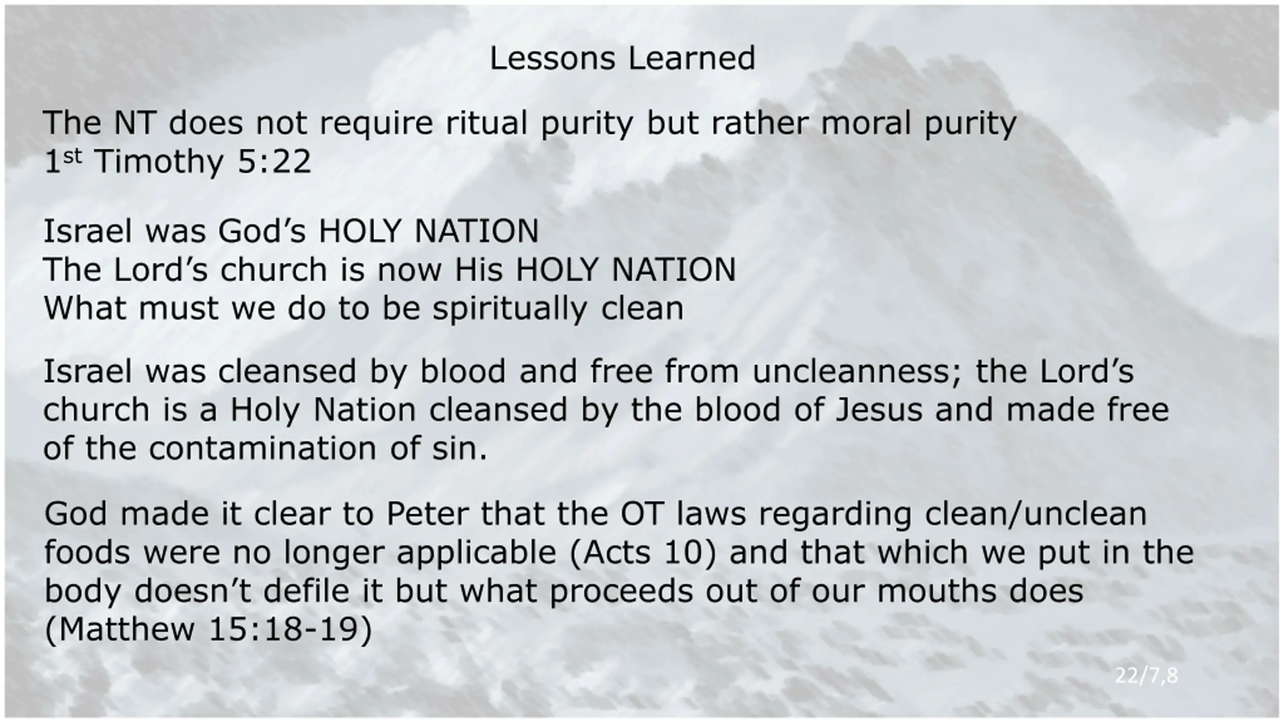 Lessons Learned The NT does not require ritual purity but rather moral purity 1st Timothy 5:22 Israel was God s HOLY NATION The Lord s church is now His HOLY NATION What must we do to be spiritually clean Israel was cleansed by blood and free from uncleanness; the Lord s church is a Holy Nation cleansed by the blood of Jesus and made free of the contamination of sin. God made it clear to Peter that the OT laws regarding clean/unclean foods were no longer applicable (Acts 10) and that which we put in the body doesn t defile it but what proceeds out of our mouths does (Matthew 15:18-19) 22/7,8