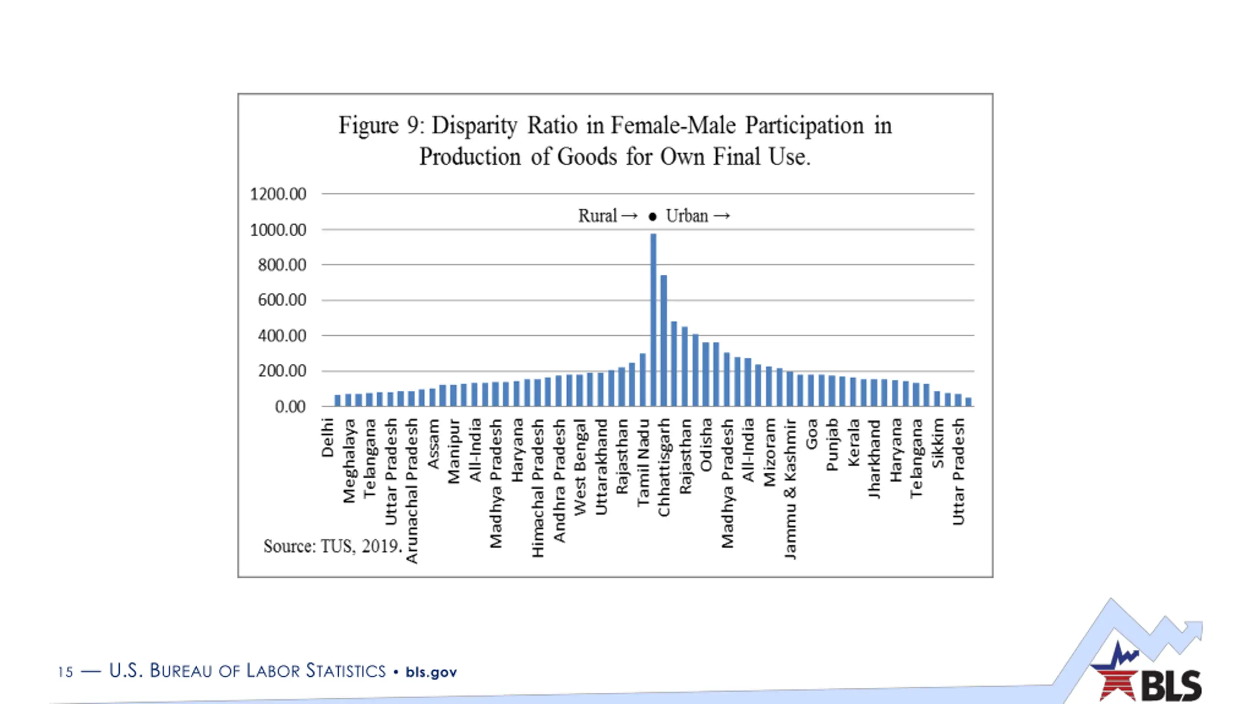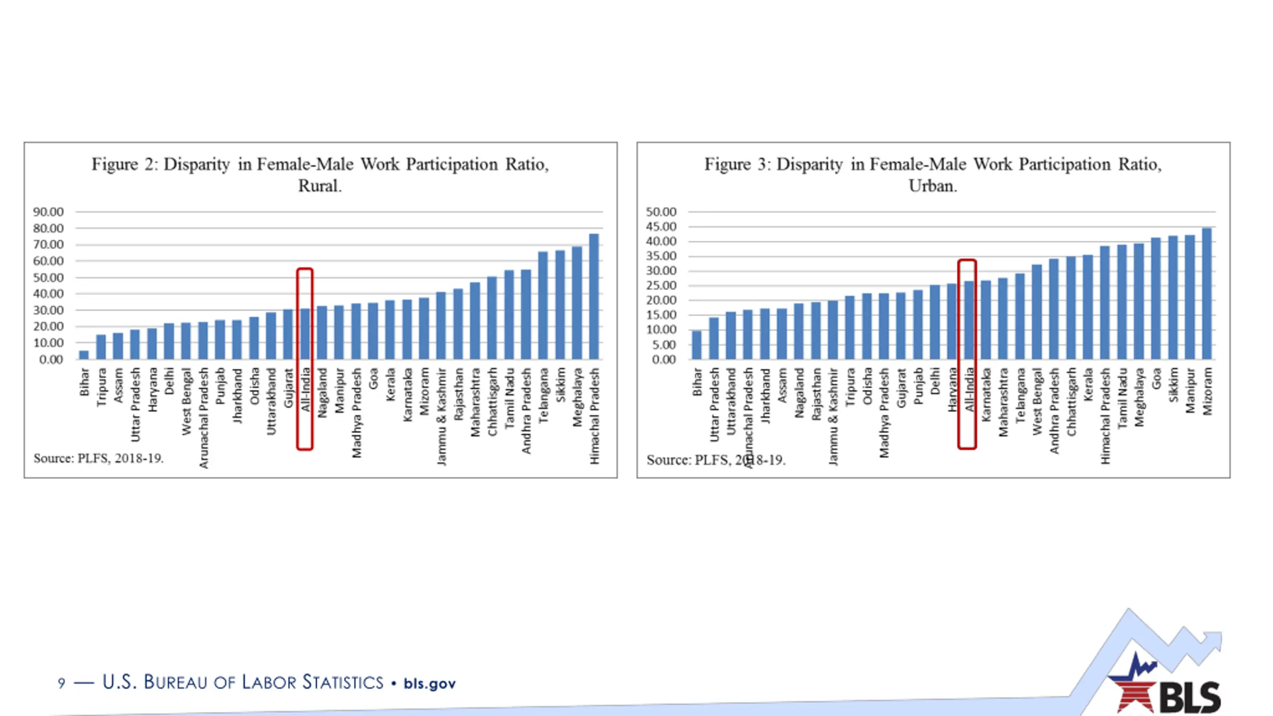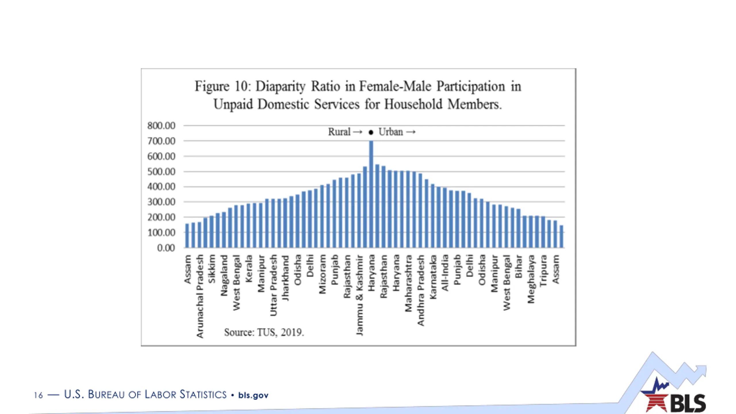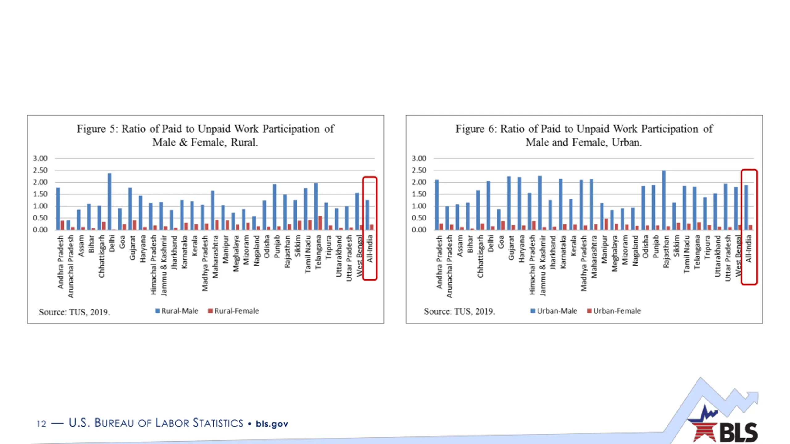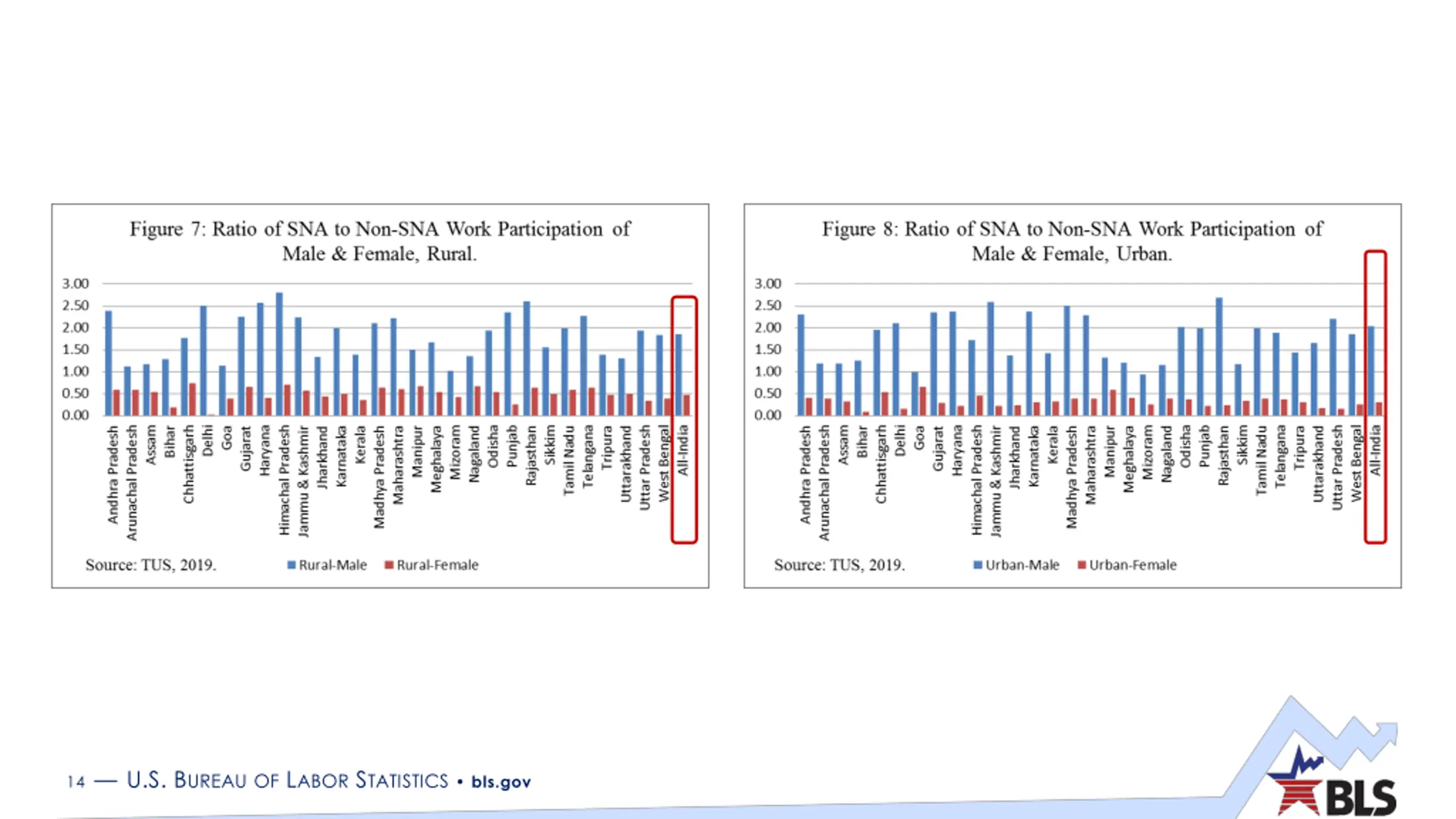 Conclusion There is huge variation in female-male paid work (especially in urban areas) and unpaid work activities across Indian states. Correlations between the state rankings in the Female-Male Worker Population Ratio and participation in employment activities are high, suggesting the surveys are capturing similar disparities in paid work. No evidence of a tradeoff between labor force participation and unpaid activities, at least in terms of participation. 18 U.S. BUREAUOF LABOR STATISTICS bls.gov