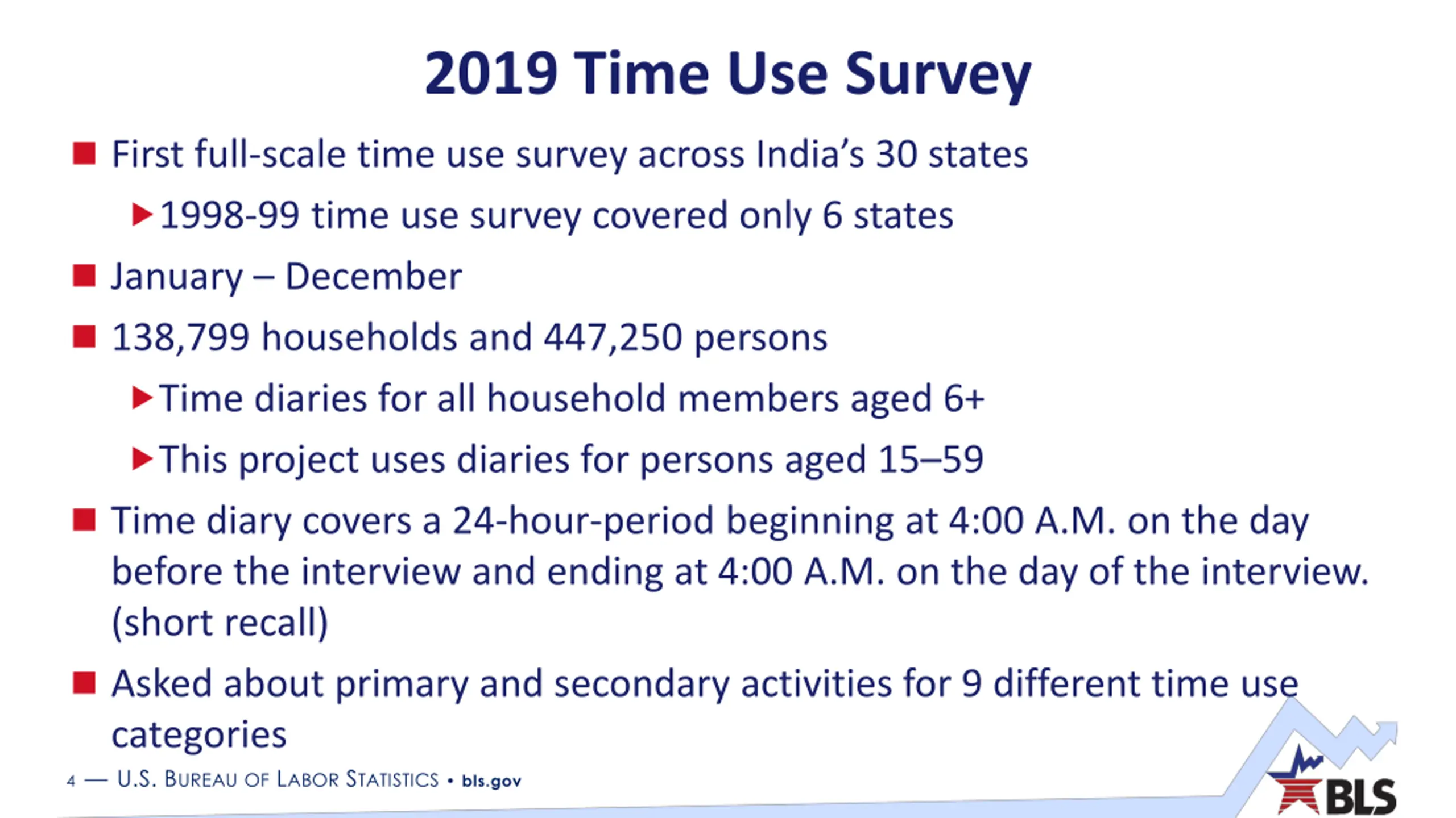 2019 Time Use Survey First full-scale time use survey across India s 30 states 1998-99 time use survey covered only 6 states January December 138,799 households and 447,250 persons Time diaries for all household members aged 6+ This project uses diaries for persons aged 15 59 Time diary covers a 24-hour-period beginning at 4:00 A.M. on the day before the interview and ending at 4:00 A.M. on the day of the interview. (short recall) Asked about primary and secondary activities for 9 different time use categories 4 U.S. BUREAUOF LABOR STATISTICS bls.gov