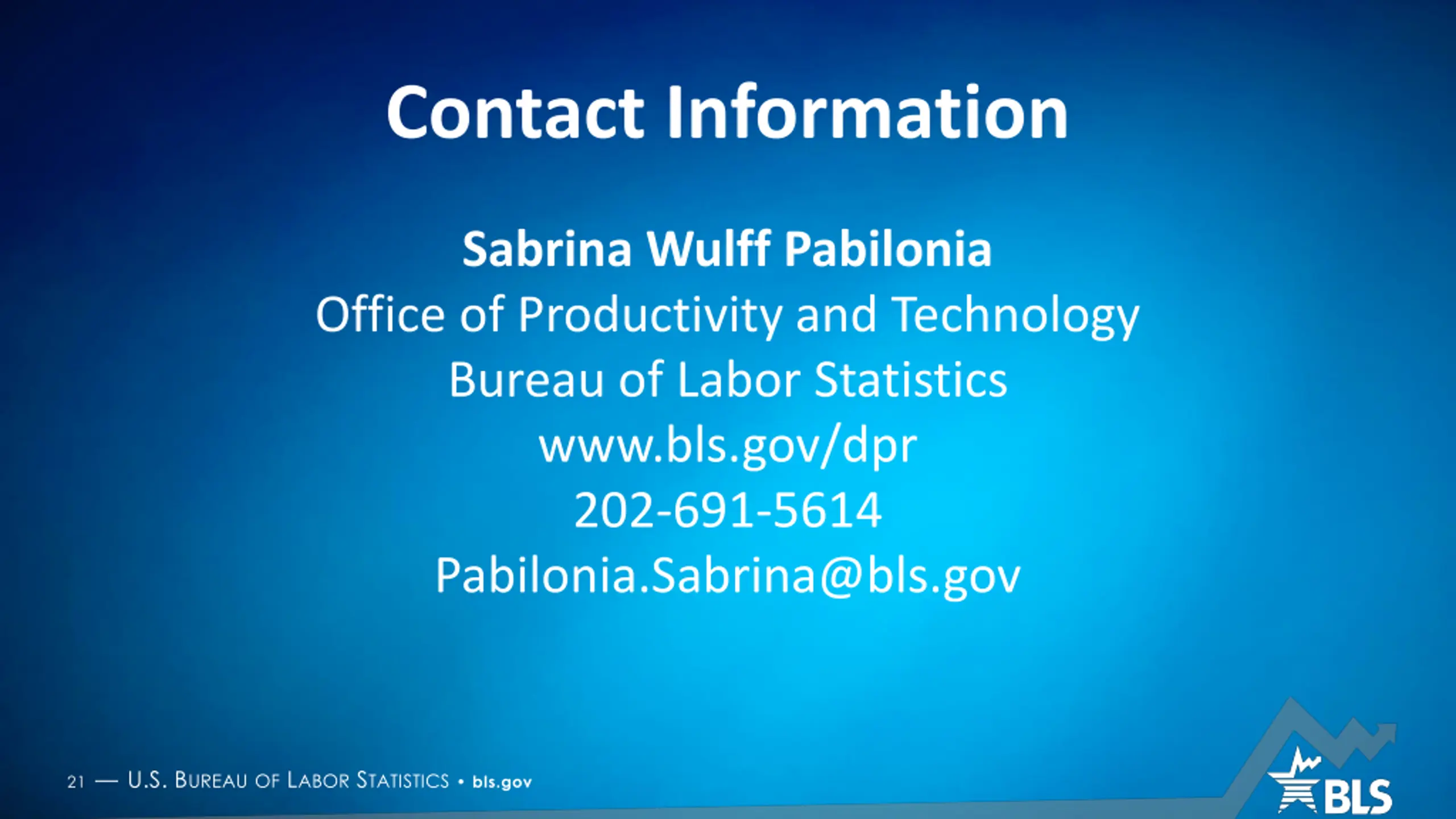 Contact Information Sabrina Wulff Pabilonia Office of Productivity and Technology Bureau of Labor Statistics www.bls.gov/dpr 202-691-5614 Pabilonia.Sabrina@bls.gov 21 U.S. BUREAUOF LABOR STATISTICS bls.gov