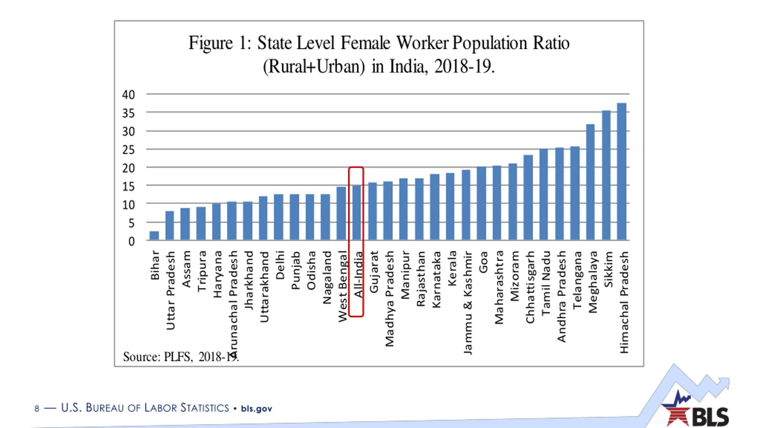 Figure 1: State Level Female Worker Population Ratio (Rural+Urban) in India, 2018-19. 40 35 30 25 20 15 10 5 0 Maharashtra Arunachal Pradesh Assam Bihar Kerala West Bengal Tripura Andhra Pradesh Haryana Delhi Tamil Nadu Jharkhand Manipur Madhya Pradesh Mizoram Nagaland Gujarat Chhattisgarh Meghalaya Odisha Jammu & Kashmir Telangana Rajasthan Karnataka Uttar Pradesh Goa All-India Himachal Pradesh Sikkim Uttarakhand Punjab Source: PLFS, 2018-19. 7 U.S. BUREAUOF LABOR STATISTICS bls.gov