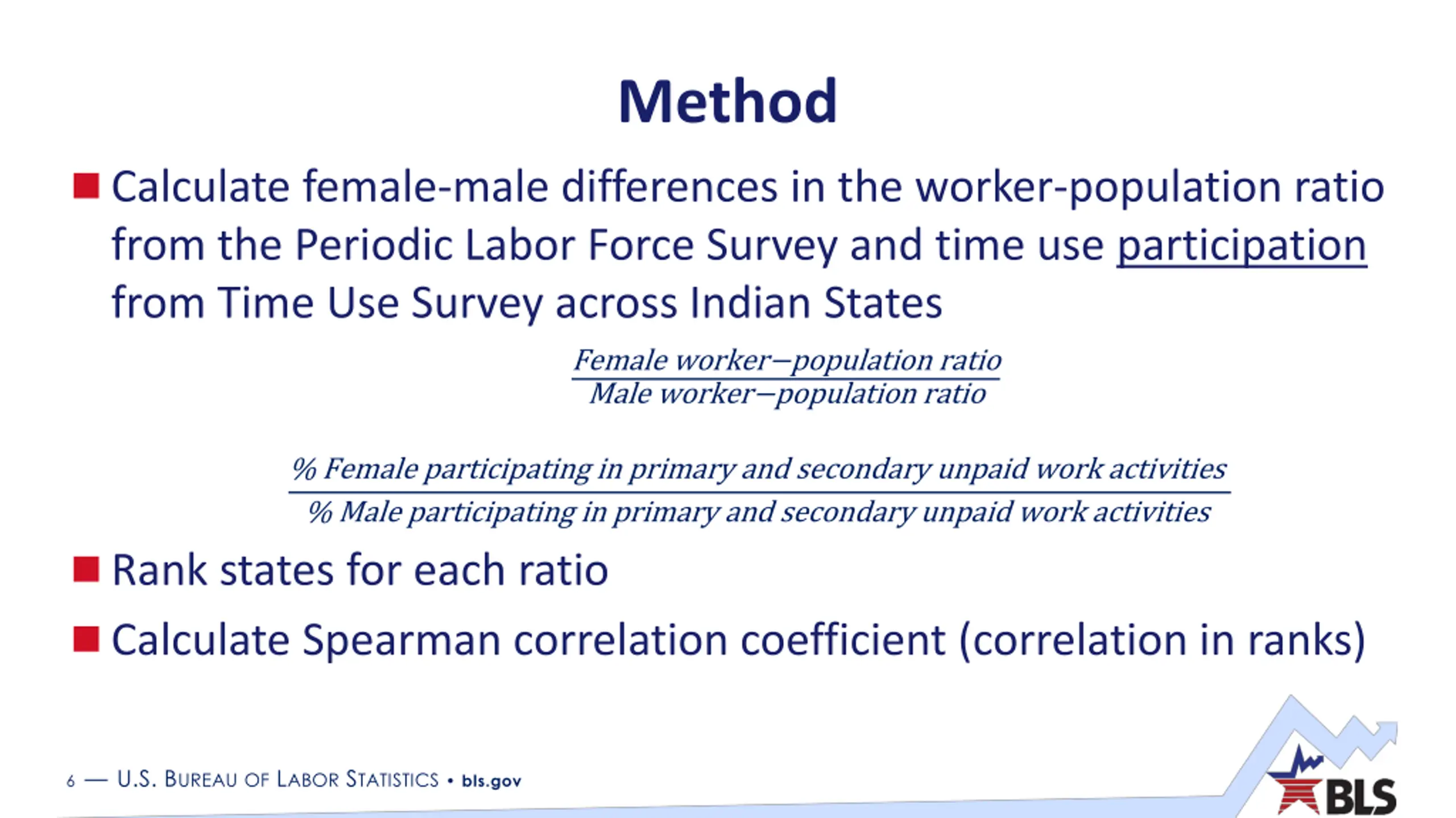 Method Calculate female-male differences in the worker-population ratio from the Periodic Labor Force Survey and time use participation from Time Use Survey across Indian States Male worker population ratio Female worker population ratio % Female participating in primary and secondary unpaid work activities % Male participating in primary and secondary unpaid work activities Rank states for each ratio Calculate Spearman correlation coefficient (correlation in ranks) 6 U.S. BUREAUOF LABOR STATISTICS bls.gov