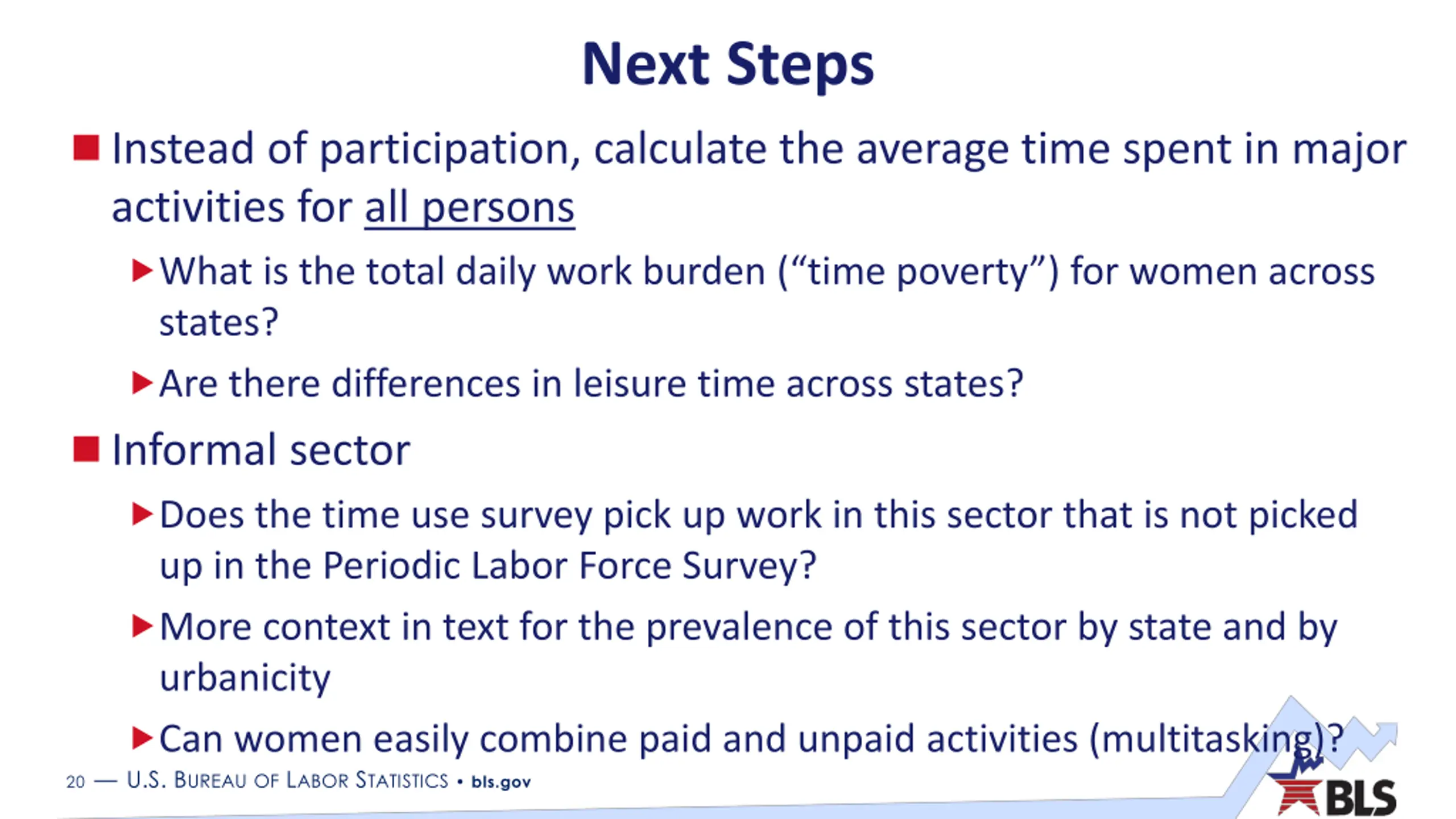 Next Steps Instead of participation, calculate the average time spent in major activities for all persons What is the total daily work burden ( time poverty ) for women across states? Are there differences in leisure time across states? Informal sector Does the time use survey pick up work in this sector that is not picked up in the Periodic Labor Force Survey? More context in text for the prevalence of this sector by state and by urbanicity Can women easily combine paid and unpaid activities (multitasking)? 20 U.S. BUREAUOF LABOR STATISTICS bls.gov