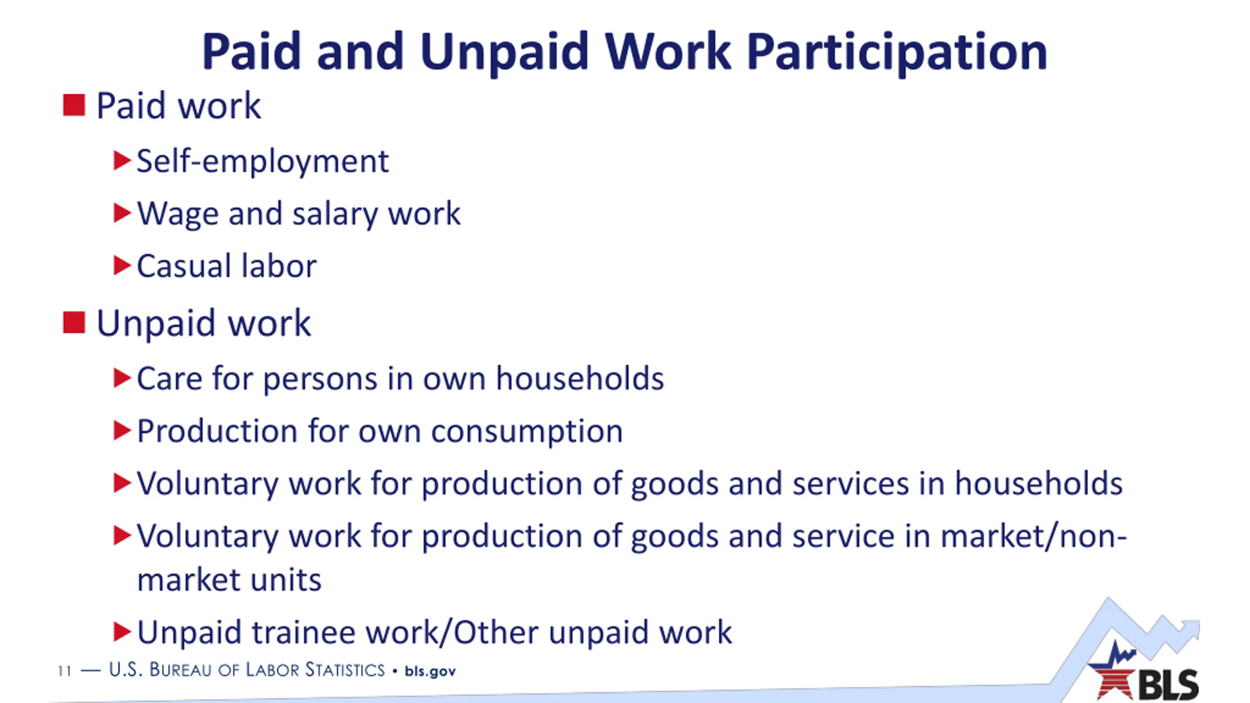 Paid and Unpaid Work Participation Paid work Self-employment Wage and salary work Casual labor Unpaid work Care for persons in own households Production for own consumption Voluntary work for production of goods and services in households Voluntary work for production of goods and service in market/non- market units Unpaid trainee work/Other unpaid work 11 U.S. BUREAUOF LABOR STATISTICS bls.gov