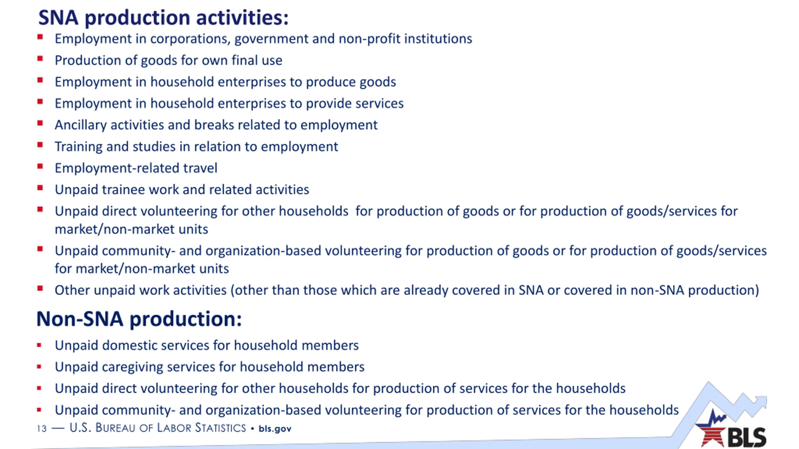 SNA production activities: Employment in corporations, government and non-profit institutions Production of goods for own final use Employment in household enterprises to produce goods Employment in household enterprises to provide services Ancillary activities and breaks related to employment Training and studies in relation to employment Employment-related travel Unpaid trainee work and related activities Unpaid direct volunteering for other households for production of goods or for production of goods/services for market/non-market units Unpaid community- and organization-based volunteering for production of goods or for production of goods/services for market/non-market units Other unpaid work activities (other than those which are already covered in SNA or covered in non-SNA production) Non-SNA production: Unpaid domestic services for household members Unpaid caregiving services for household members Unpaid direct volunteering for other households for production of services for the households Unpaid community- and organization-based volunteering for production of services for the households 13 U.S. BUREAUOF LABOR STATISTICS bls.gov