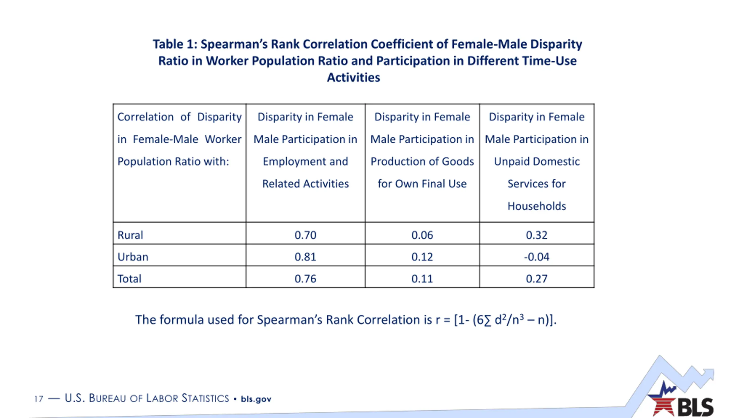 Table 1: Spearmans Rank Correlation Coefficient of Female-Male Disparity Ratio in Worker Population Ratio and Participation in Different Time-Use Activities Correlation of Disparity Disparity in Female Disparity in Female Disparity in Female in Female-Male Worker Male Participation in Male Participation in Male Participation in Population Ratio with: Employment and Production of Goods Unpaid Domestic Related Activities for Own Final Use Services for Households Rural 0.70 0.06 0.32 Urban 0.81 0.12 -0.04 Total 0.76 0.11 0.27 The formula used for Spearman s Rank Correlation is r = [1- (6 d2/n3 n)]. 17 U.S. BUREAUOF LABOR STATISTICS bls.gov
