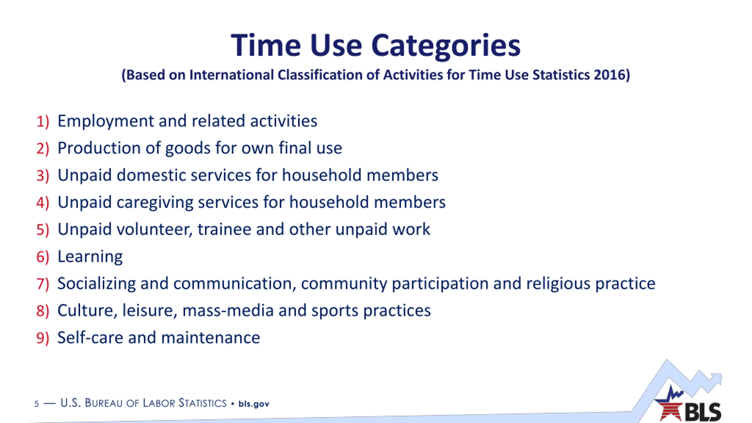 Time Use Categories (Based on International Classification of Activities for Time Use Statistics 2016) 1) Employment and related activities 2) Production of goods for own final use 3) Unpaid domestic services for household members 4) Unpaid caregiving services for household members 5) Unpaid volunteer, trainee and other unpaid work 6) Learning 7) Socializing and communication, community participation and religious practice 8) Culture, leisure, mass-media and sports practices 9) Self-care and maintenance 5 U.S. BUREAUOF LABOR STATISTICS bls.gov