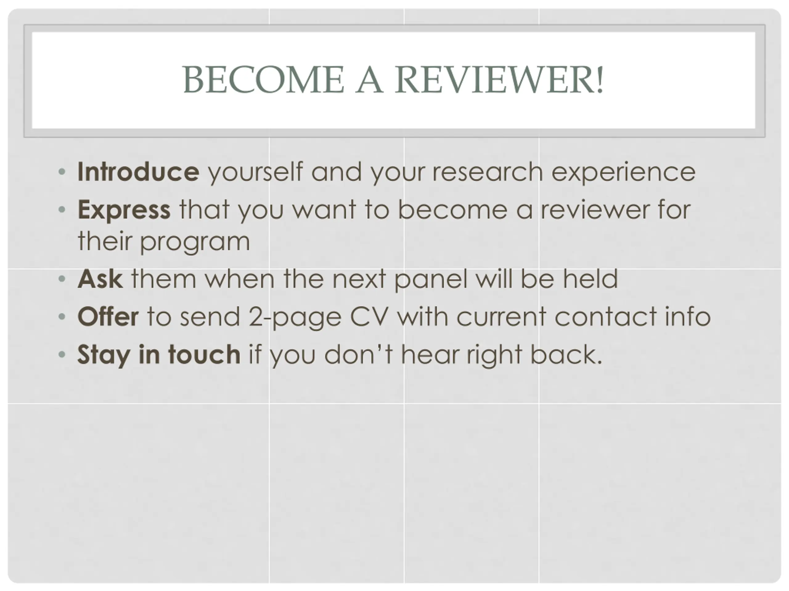 BECOME A REVIEWER! Introduce yourself and your research experience Express that you want to become a reviewer for their program Ask them when the next panel will be held Offer to send 2-page CV with current contact info Stay in touch if you don t hear right back.