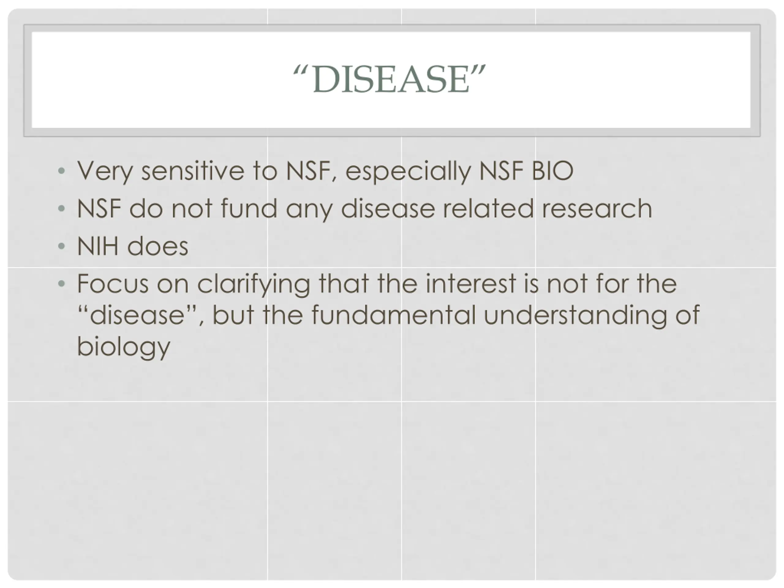 DISEASE Very sensitive to NSF, especially NSF BIO NSF do not fund any disease related research NIH does Focus on clarifying that the interest is not for the disease , but the fundamental understanding of biology