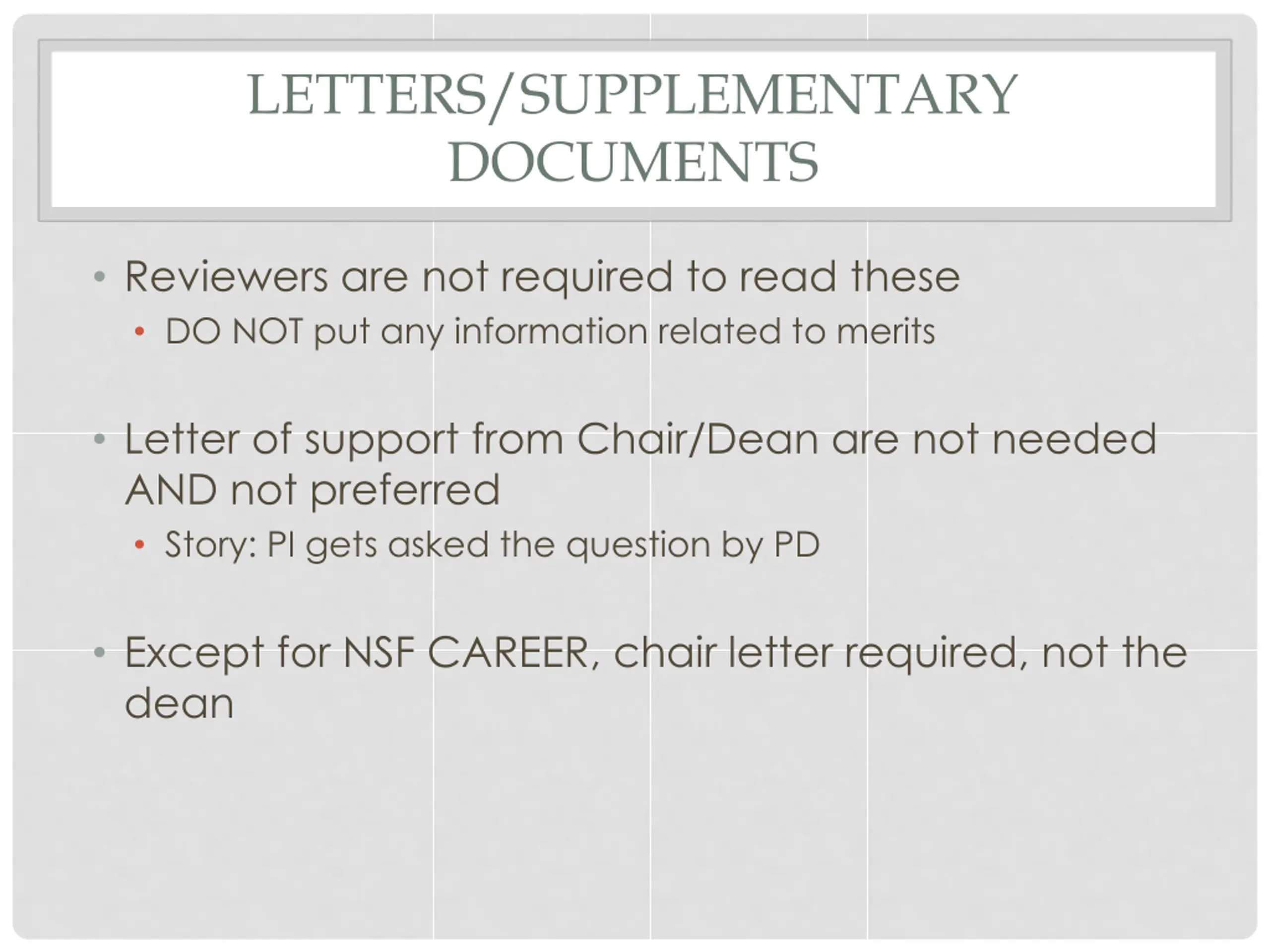 LETTERS/SUPPLEMENTARY DOCUMENTS Reviewers are not required to read these DO NOT put any information related to merits Letter of support from Chair/Dean are not needed AND not preferred Story: PI gets asked the question by PD Except for NSF CAREER, chair letter required, not the dean