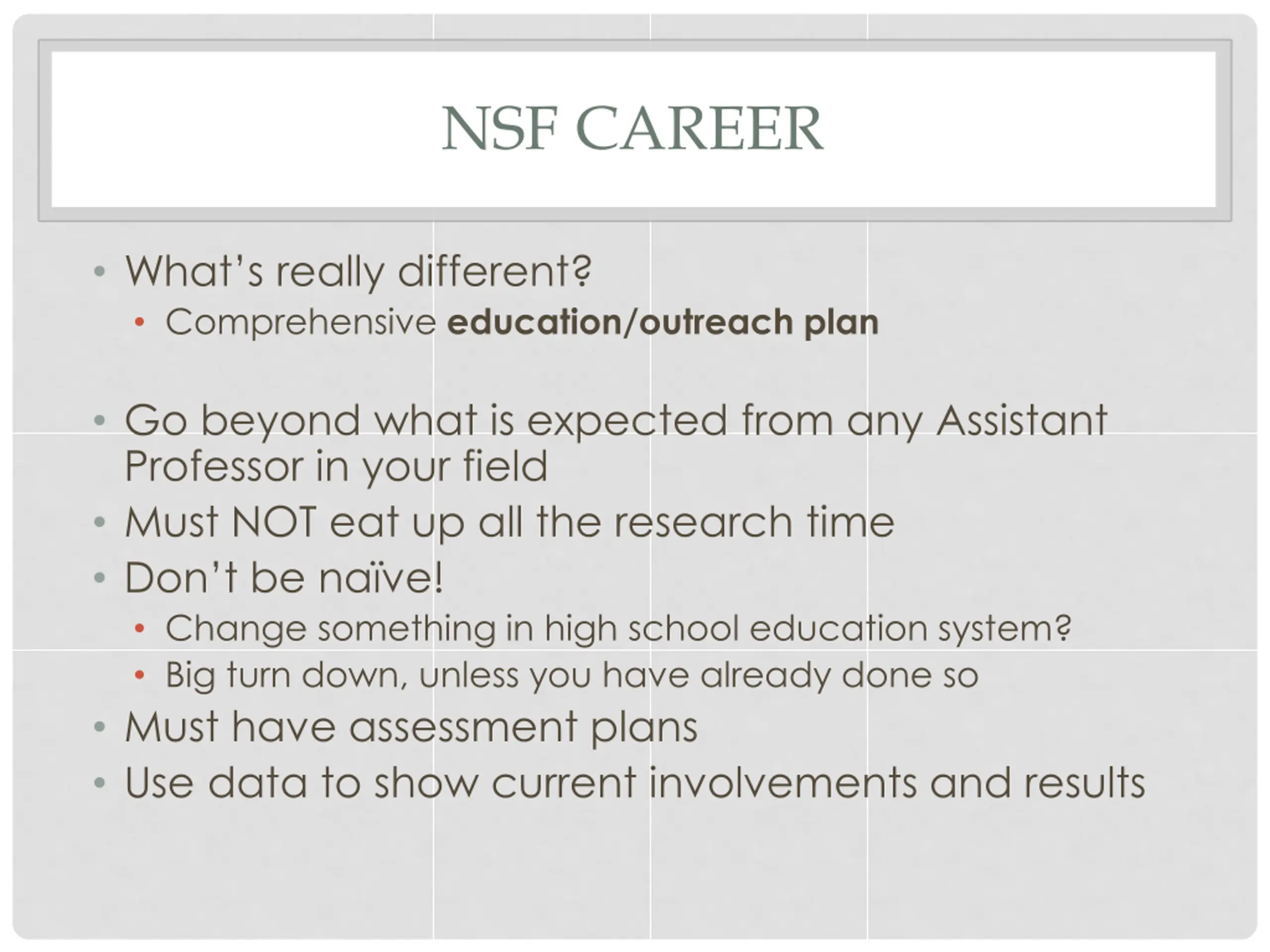 NSF CAREER What s really different? Comprehensive education/outreach plan Go beyond what is expected from any Assistant Professor in your field Must NOT eat up all the research time Don t be na ve! Change something in high school education system? Big turn down, unless you have already done so Must have assessment plans Use data to show current involvements and results