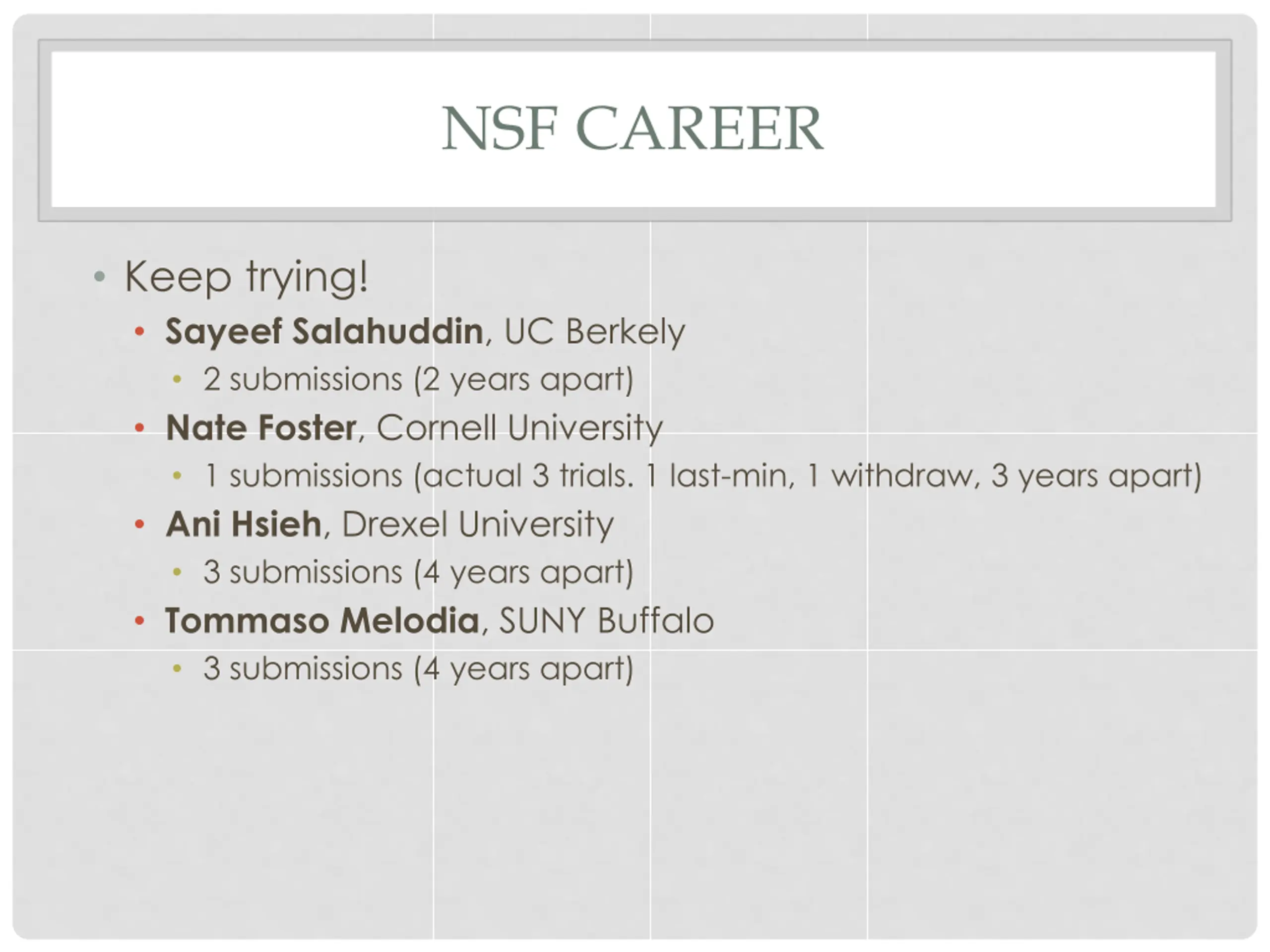 NSF CAREER Keep trying! Sayeef Salahuddin, UC Berkely 2 submissions (2 years apart) Nate Foster, Cornell University 1 submissions (actual 3 trials. 1 last-min, 1 withdraw, 3 years apart) Ani Hsieh, Drexel University 3 submissions (4 years apart) Tommaso Melodia, SUNY Buffalo 3 submissions (4 years apart)