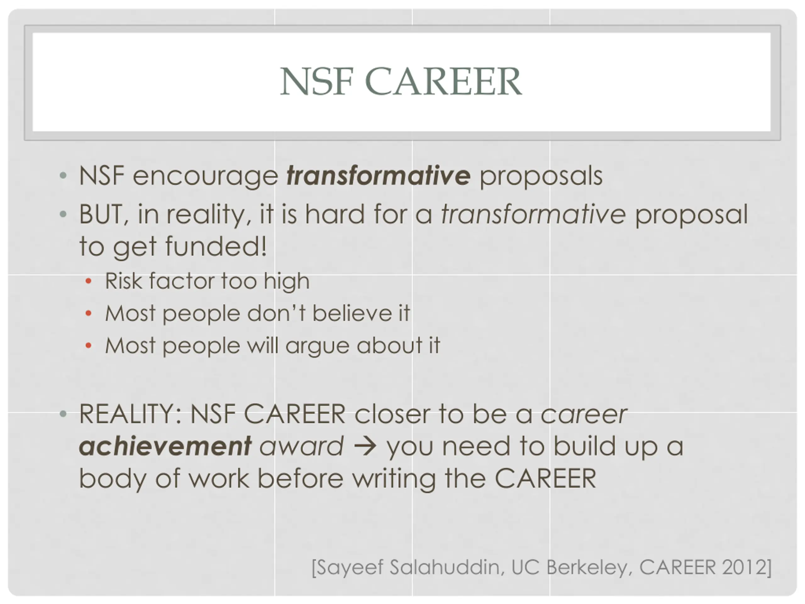 NSF CAREER NSF encourage transformative proposals BUT, in reality, it is hard for a transformative proposal to get funded! Risk factor too high Most people don t believe it Most people will argue about it REALITY: NSF CAREER closer to be a career achievement award you need to build up a body of work before writing the CAREER [Sayeef Salahuddin, UC Berkeley, CAREER 2012]