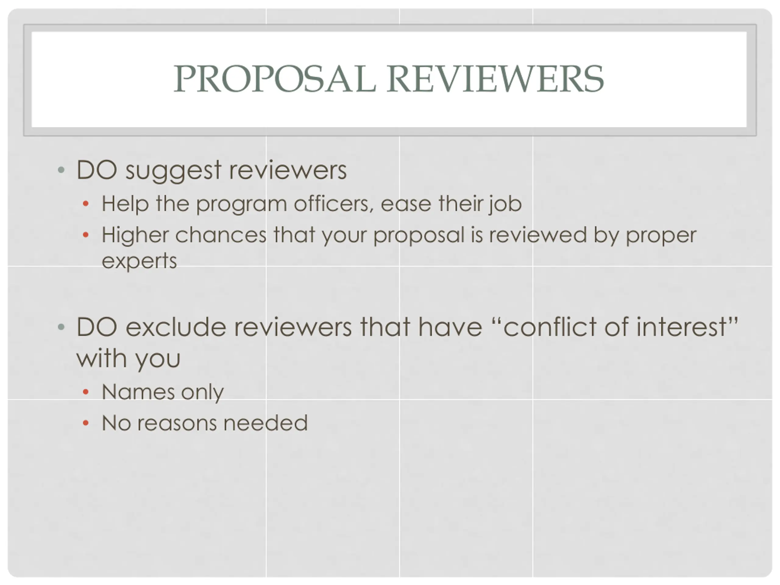 PROPOSAL REVIEWERS DO suggest reviewers Help the program officers, ease their job Higher chances that your proposal is reviewed by proper experts DO exclude reviewers that have conflict of interest with you Names only No reasons needed