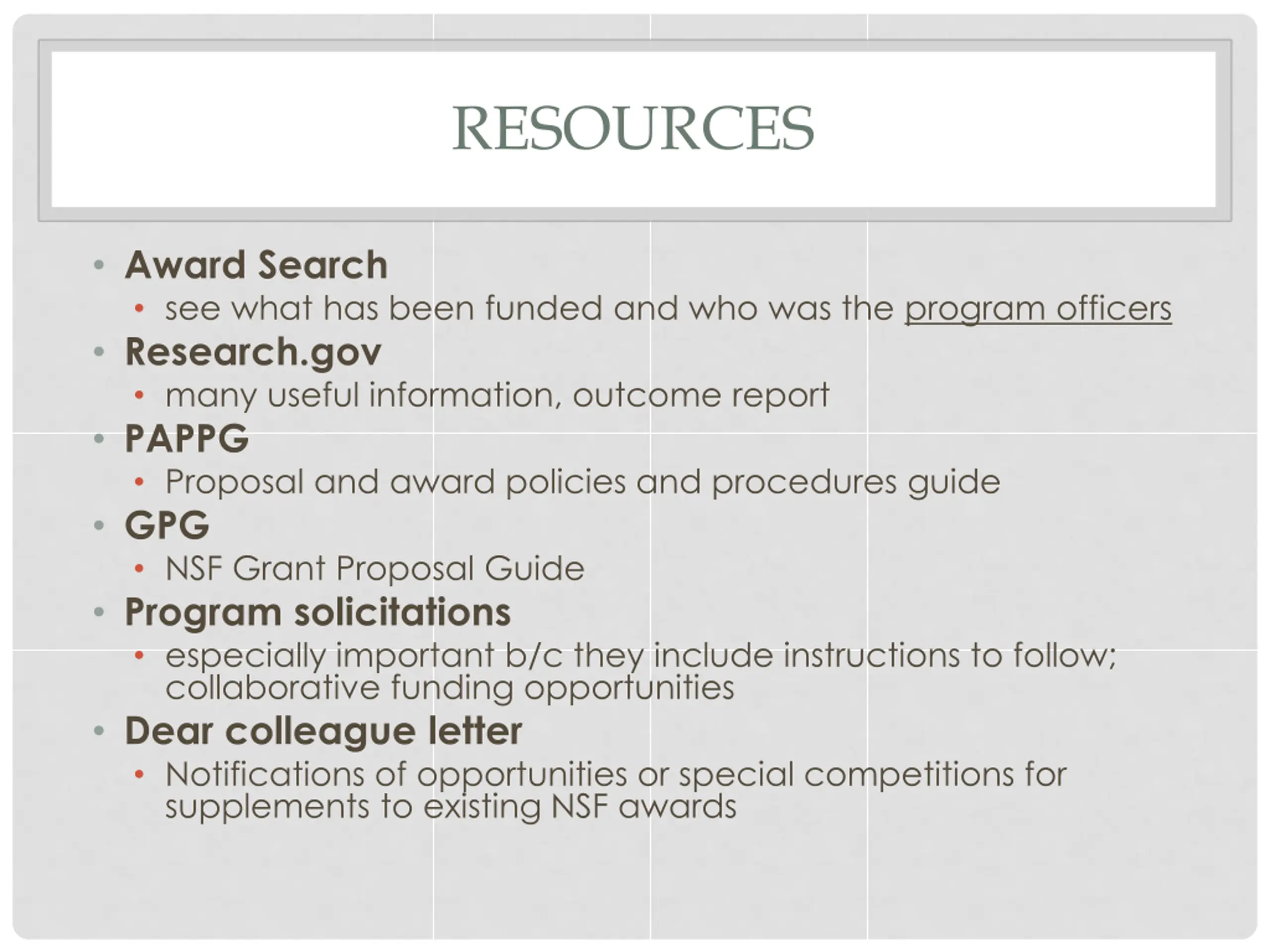 RESOURCES Award Search see what has been funded and who was the program officers Research.gov many useful information, outcome report PAPPG Proposal and award policies and procedures guide GPG NSF Grant Proposal Guide Program solicitations especially important b/c they include instructions to follow; collaborative funding opportunities Dear colleague letter Notifications of opportunities or special competitions for supplements to existing NSF awards