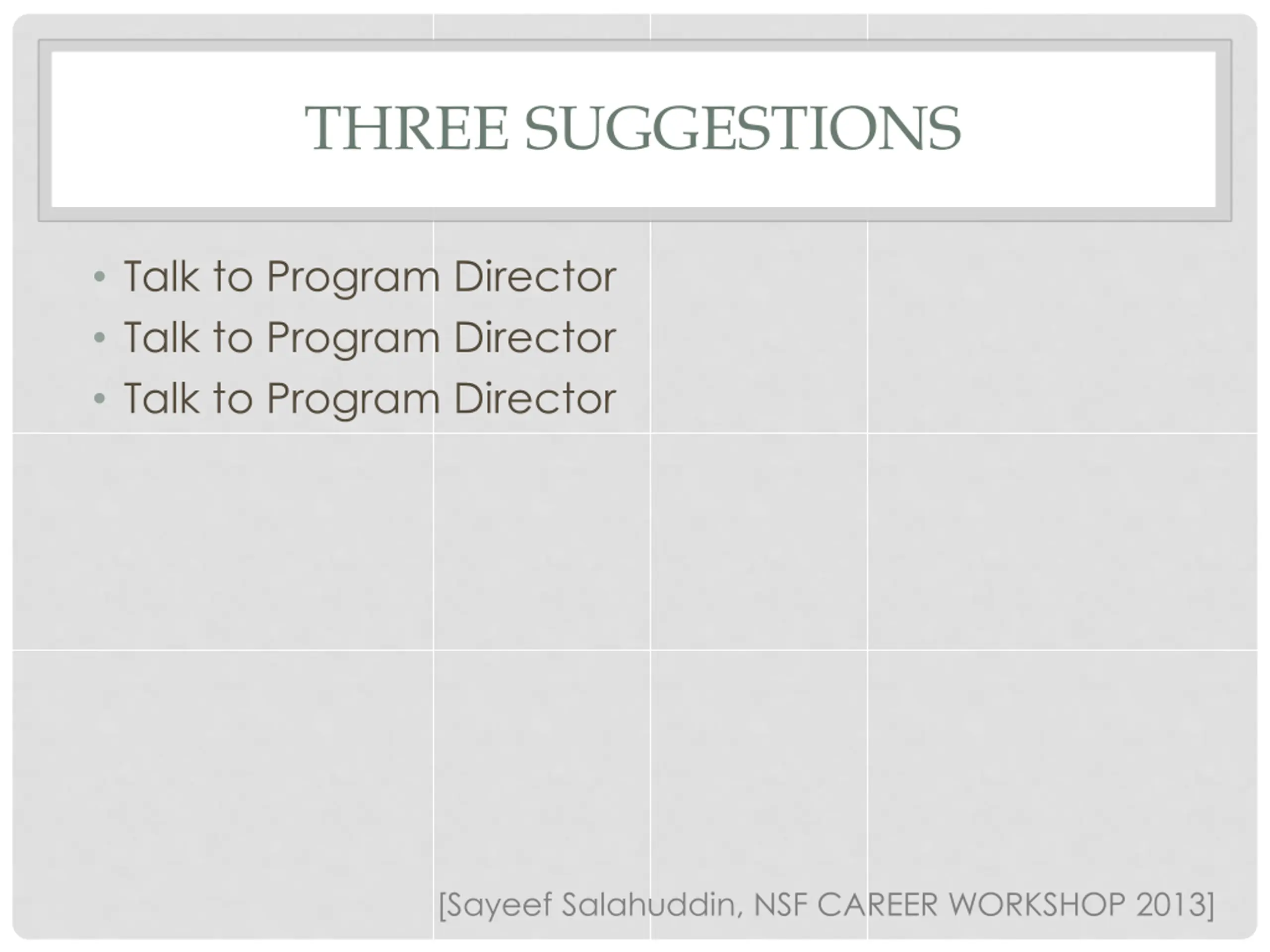 THREE SUGGESTIONS Talk to Program Director Talk to Program Director Talk to Program Director [Sayeef Salahuddin, NSF CAREER WORKSHOP 2013]