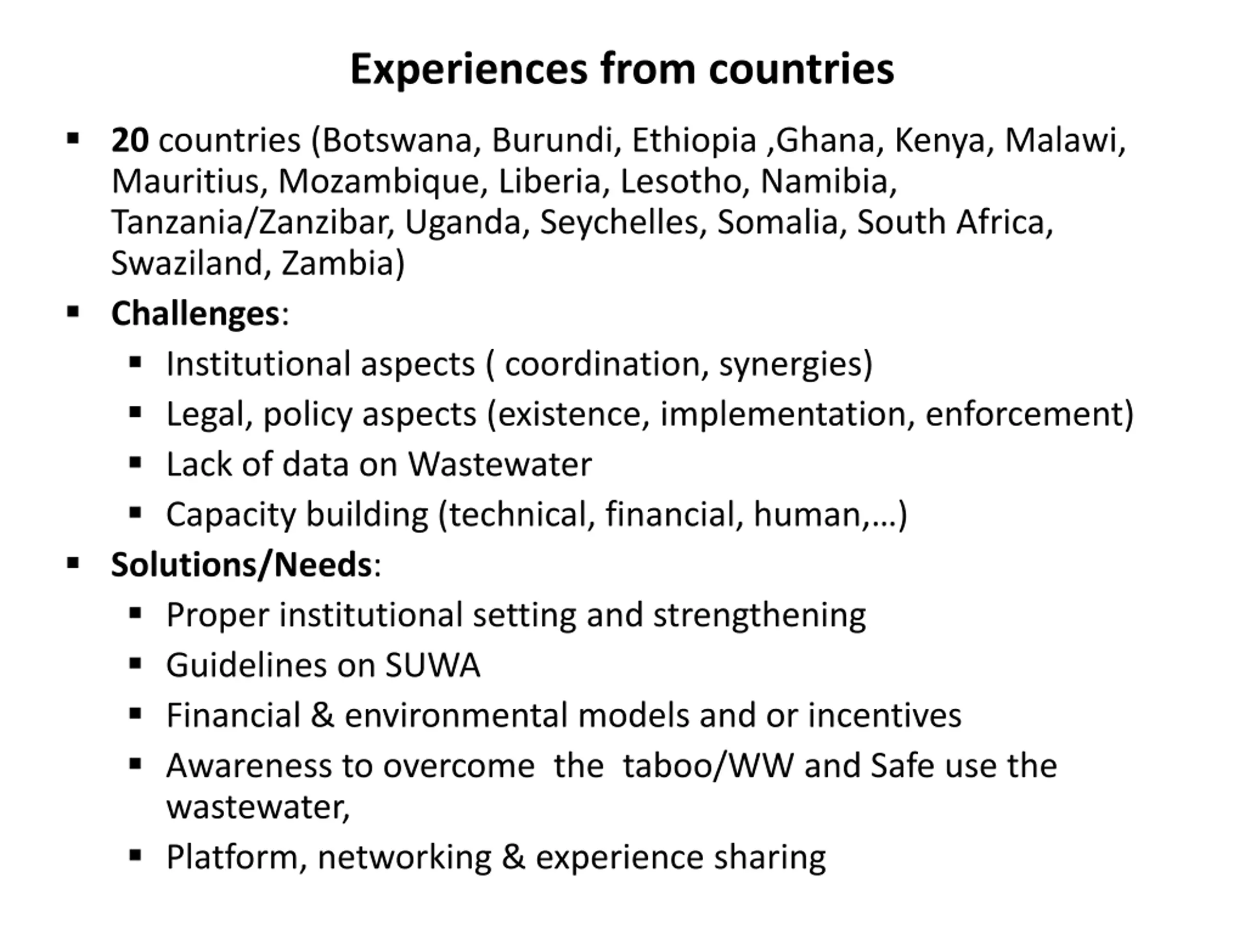 Experiences from countries 20 countries (Botswana, Burundi, Ethiopia ,Ghana, Kenya, Malawi, Mauritius, Mozambique, Liberia, Lesotho, Namibia, Tanzania/Zanzibar, Uganda, Seychelles, Somalia, South Africa, Swaziland, Zambia) Challenges: Institutional aspects ( coordination, synergies) Legal, policy aspects (existence, implementation, enforcement) Lack of data on Wastewater Capacity building (technical, financial, human, ) Solutions/Needs: Proper institutional setting and strengthening Guidelines on SUWA Financial & environmental models and or incentives Awareness to overcome the taboo/WW and Safe use the wastewater, Platform, networking & experience sharing
