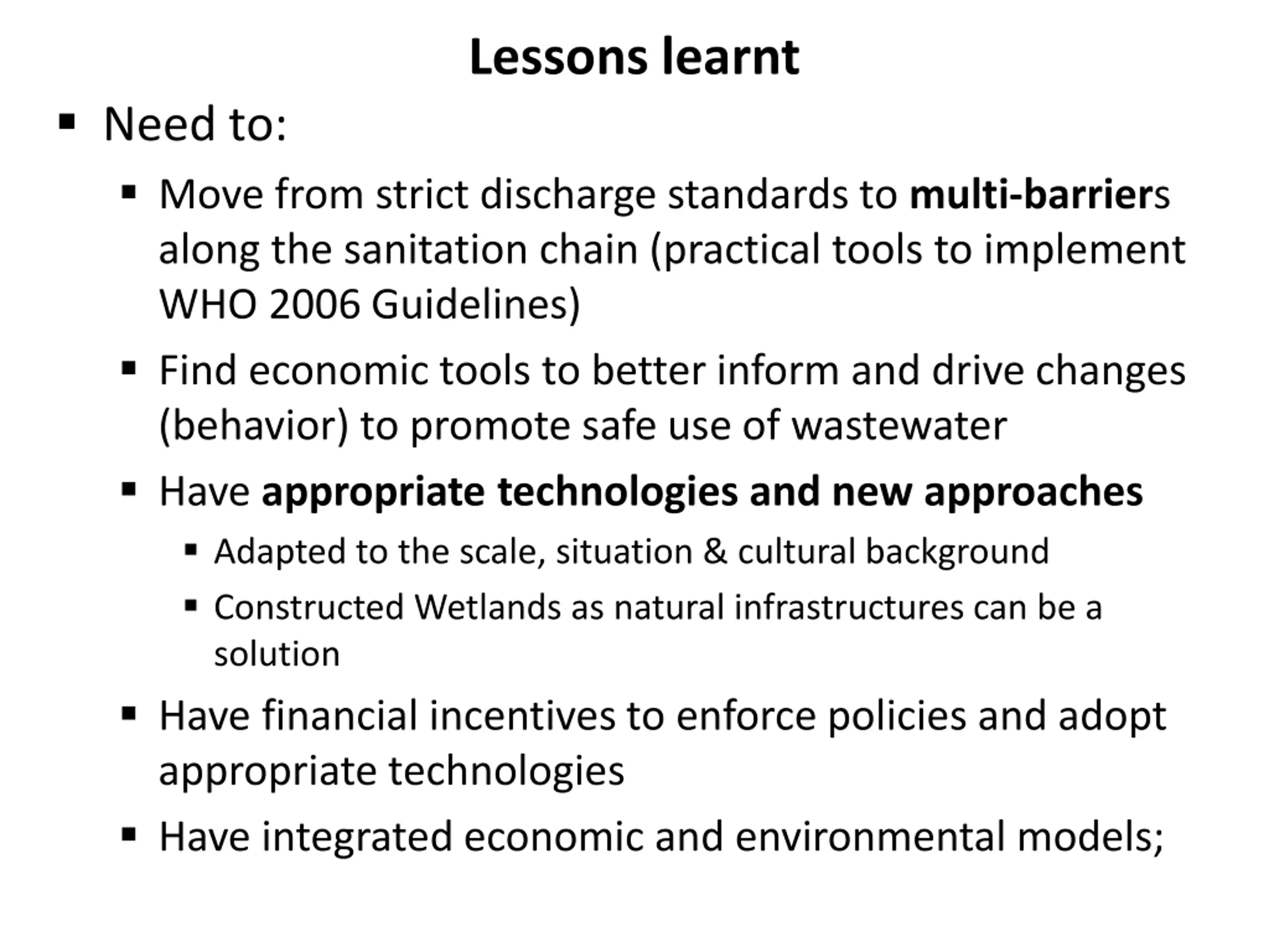 Lessons learnt Need to: Move from strict discharge standards to multi-barriers along the sanitation chain (practical tools to implement WHO 2006 Guidelines) Find economic tools to better inform and drive changes (behavior) to promote safe use of wastewater Have appropriate technologies and new approaches Adapted to the scale, situation & cultural background Constructed Wetlands as natural infrastructures can be a solution Have financial incentives to enforce policies and adopt appropriate technologies Have integrated economic and environmental models;