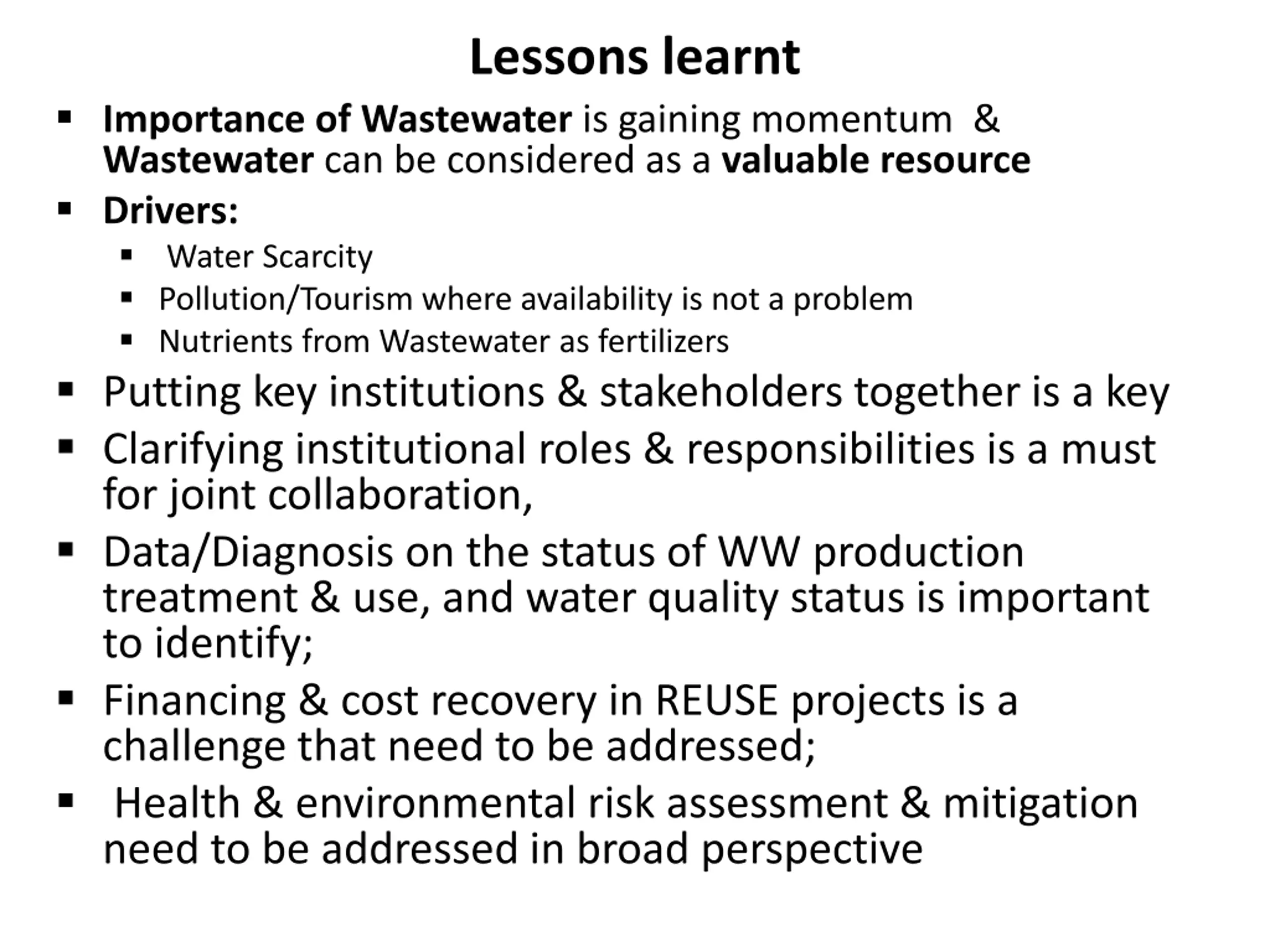 Lessons learnt Importance of Wastewater is gaining momentum & Wastewater can be considered as a valuable resource Drivers: Water Scarcity Pollution/Tourism where availability is not a problem Nutrients from Wastewater as fertilizers Putting key institutions & stakeholders together is a key Clarifying institutional roles & responsibilities is a must for joint collaboration, Data/Diagnosis on the status of WW production treatment & use, and water quality status is important to identify; Financing & cost recovery in REUSE projects is a challenge that need to be addressed; Health & environmental risk assessment & mitigation need to be addressed in broad perspective