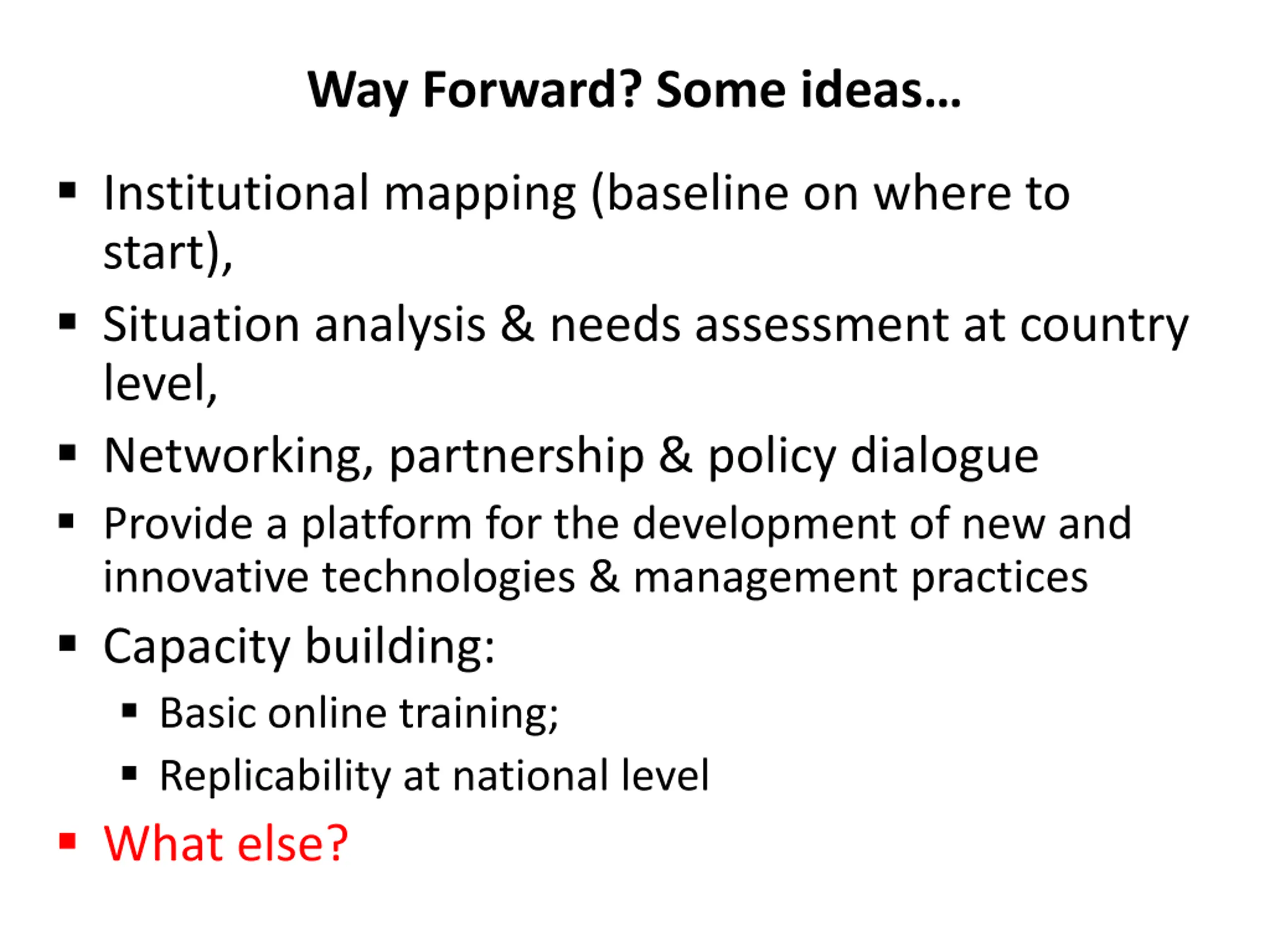 Way Forward? Some ideas Institutional mapping (baseline on where to start), Situation analysis & needs assessment at country level, Networking, partnership & policy dialogue Provide a platform for the development of new and innovative technologies & management practices Capacity building: Basic online training; Replicability at national level What else?