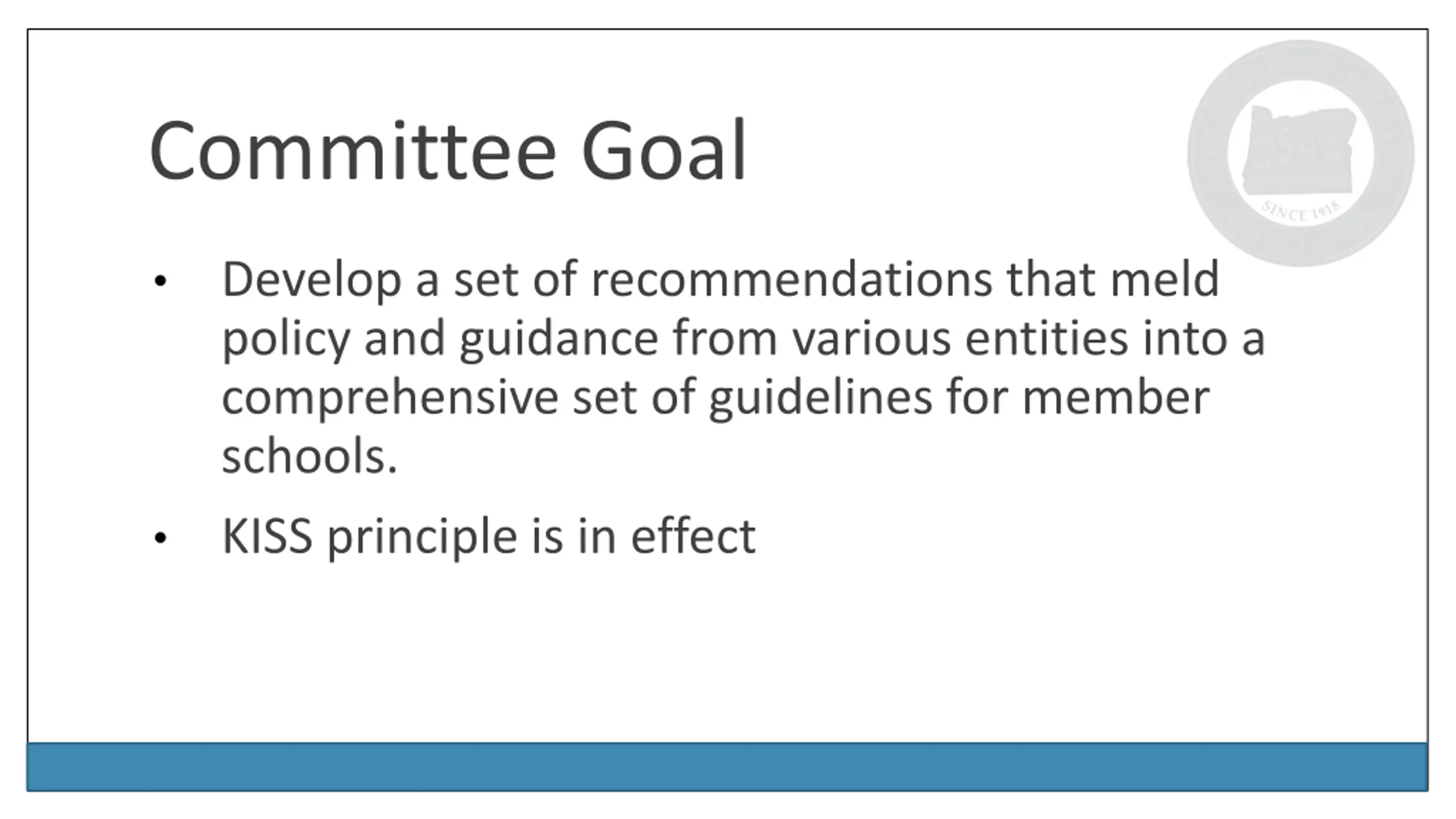 Committee Goal Develop a set of recommendations that meld policy and guidance from various entities into a comprehensive set of guidelines for member schools. KISS principle is in effect
