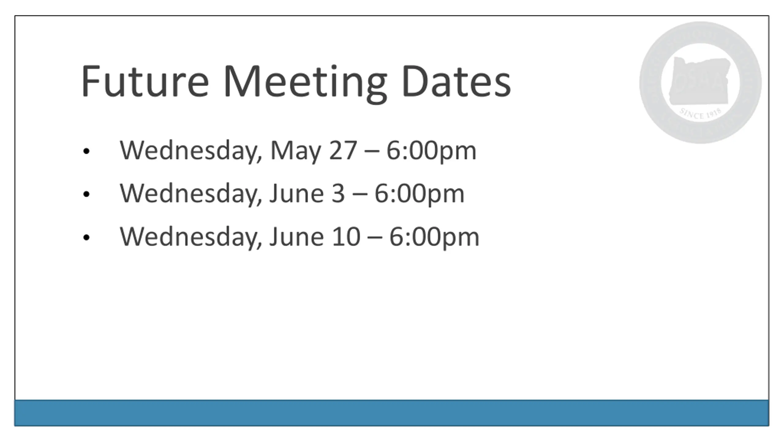 Future Meeting Dates Wednesday, May 27 6:00pm Wednesday, June 3 6:00pm Wednesday, June 10 6:00pm