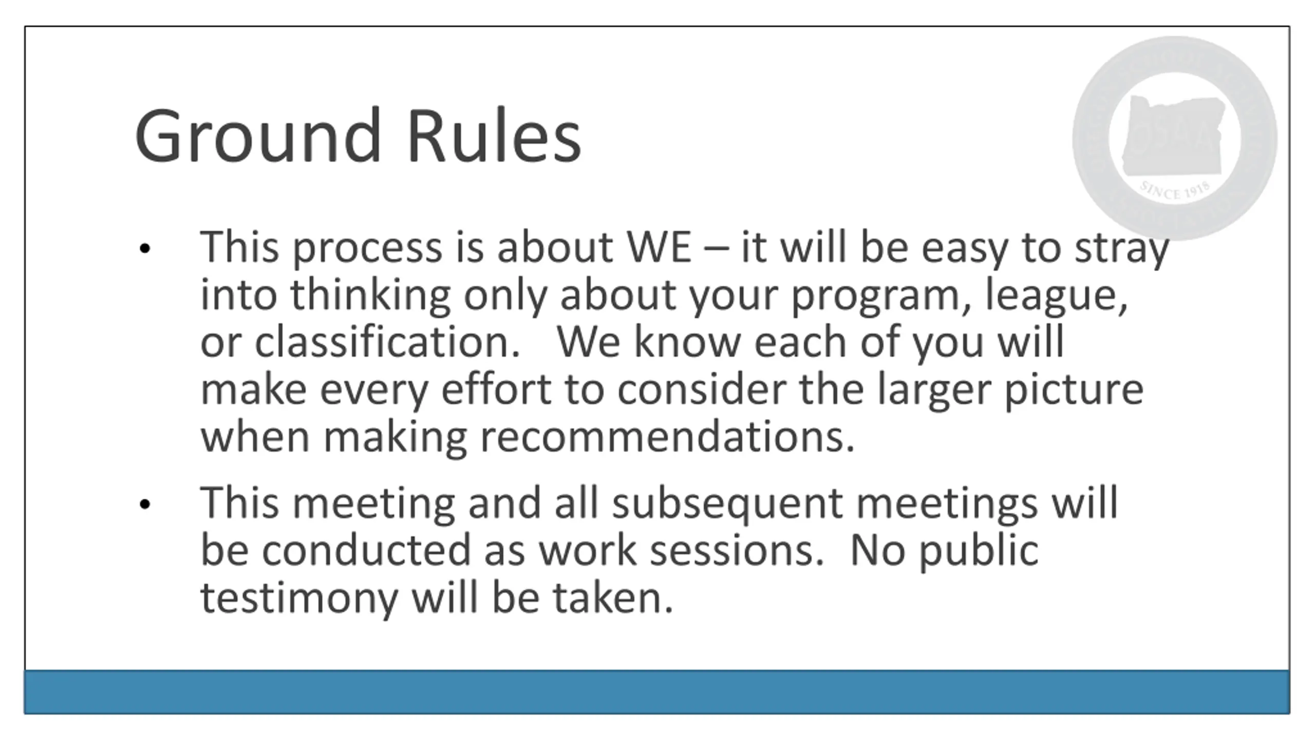 Ground Rules This process is about WE it will be easy to stray into thinking only about your program, league, or classification. We know each of you will make every effort to consider the larger picture when making recommendations. This meeting and all subsequent meetings will be conducted as work sessions. No public testimony will be taken.