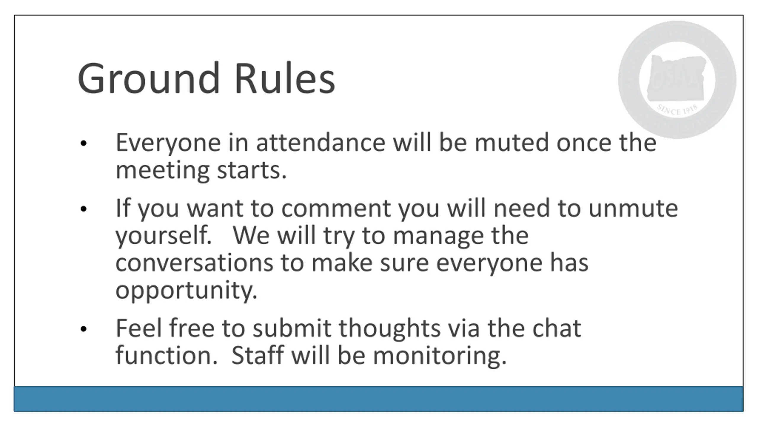 Ground Rules Everyone in attendance will be muted once the meeting starts. If you want to comment you will need to unmute yourself. We will try to manage the conversations to make sure everyone has opportunity. Feel free to submit thoughts via the chat function. Staff will be monitoring.